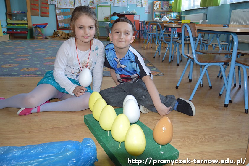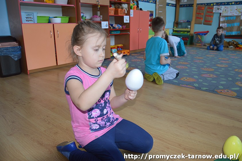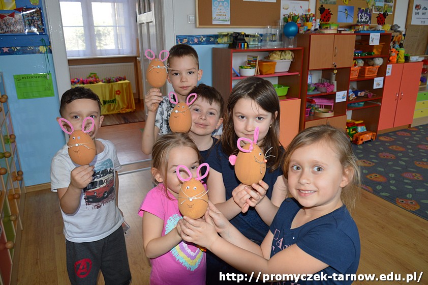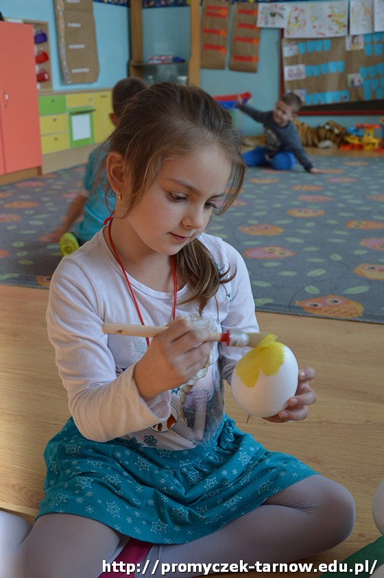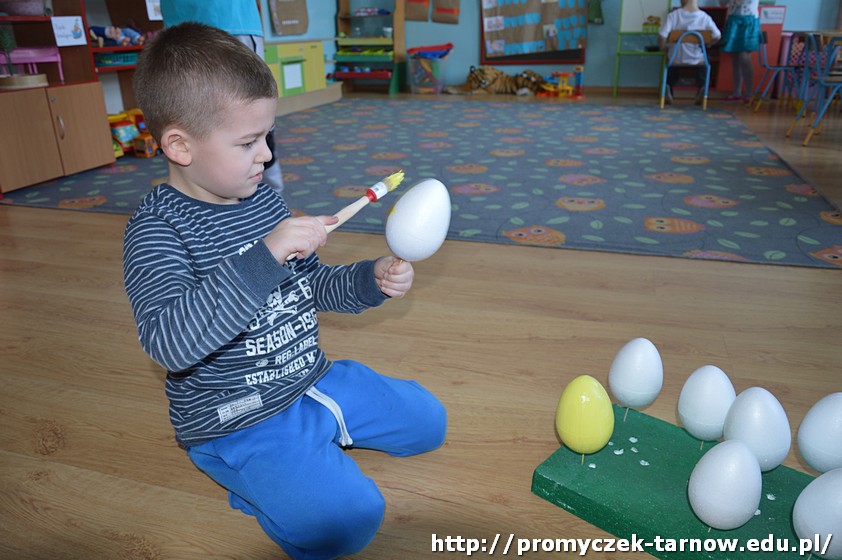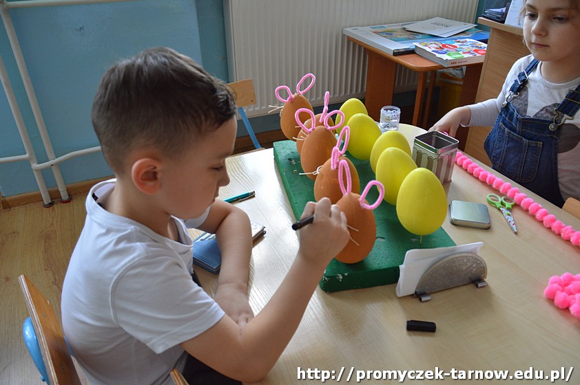 Pani Ula postanowiła, że nie będą to zwykłe pisanki, ale zajączki i kurczaki z jajek! Przedszkolaki malowały, przyklejały i ozdabiały jajka, aż powstały małe cuda, które już niedługo ozdobią tarnowską ulicę.
