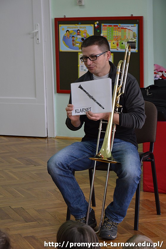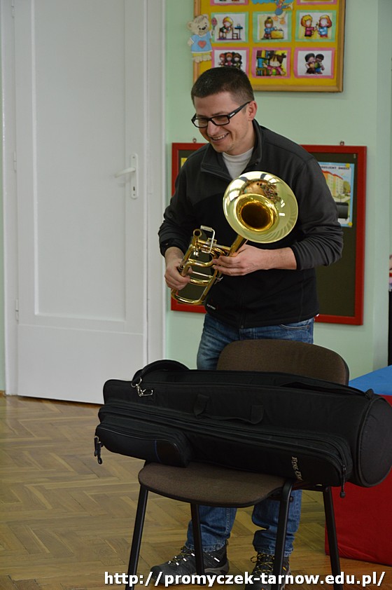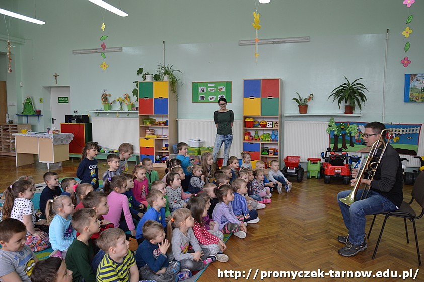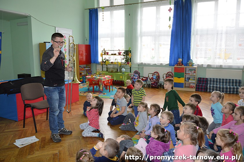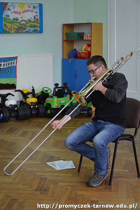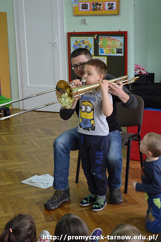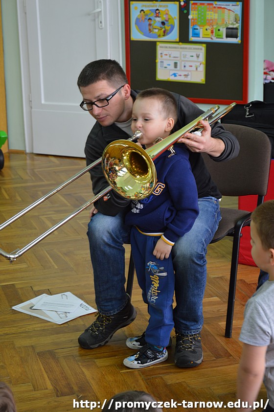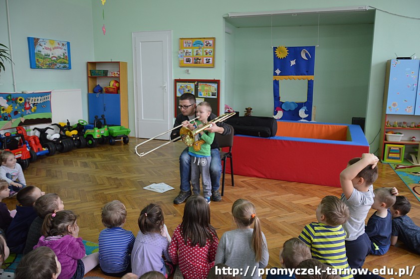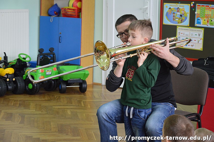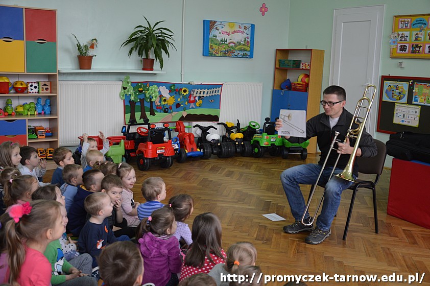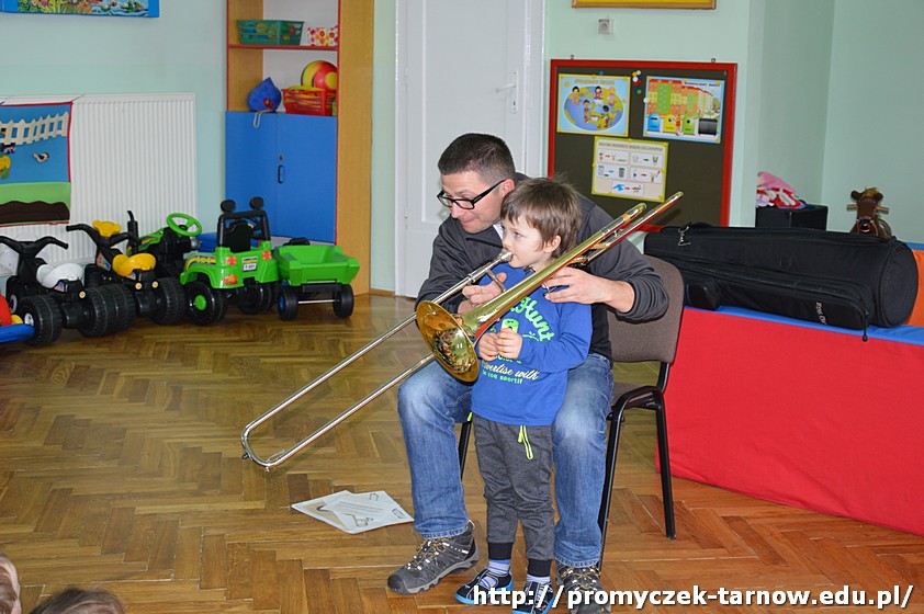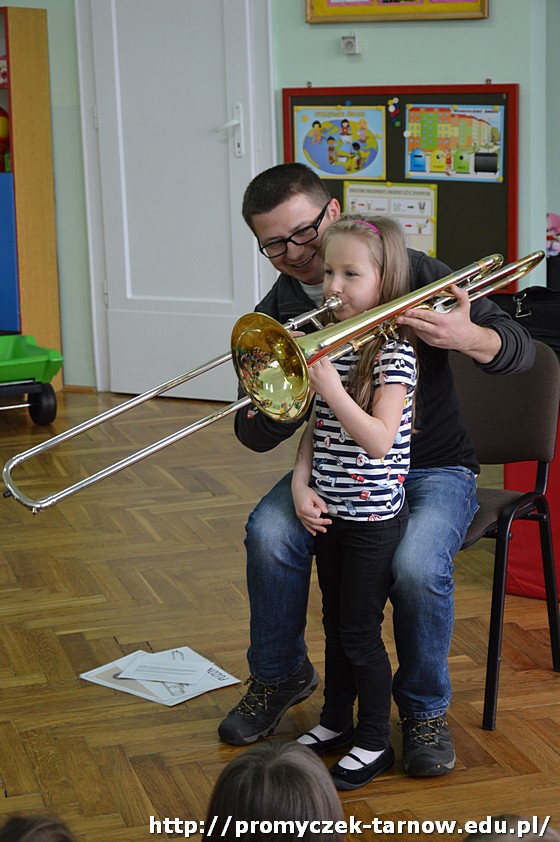 Przedszkolaki dowiedziały się jaki był początek muzyki jazzowej oraz jakie instrumenty są dla jazzu charakterystyczne. Pan Robert przygotował dzieciom niespodziankę w postaci prezentacji puzonu- instrumentu na którym gra osobiście. Dzieci mogły nie tylko usłyszeń wykonanych przez Pana Roberta najpopularniejszych utworów, ale również spróbować zagrać z nim kilka nut.