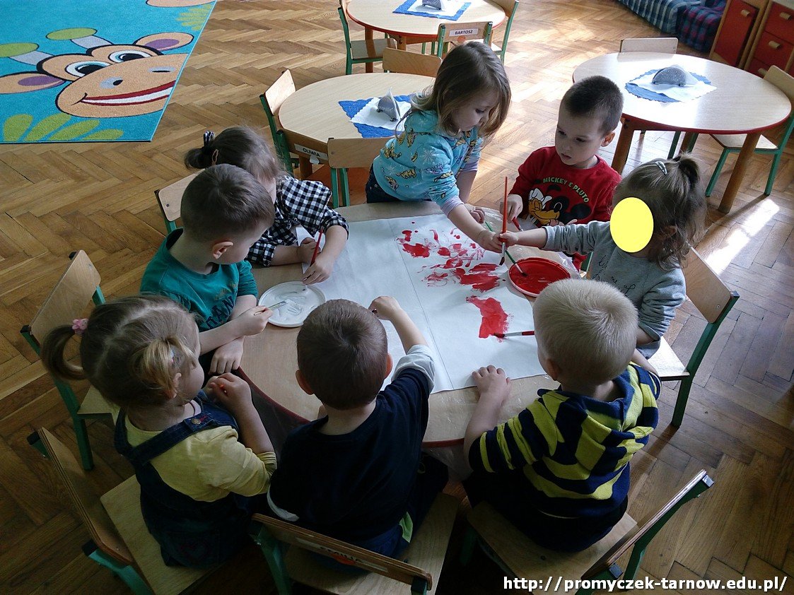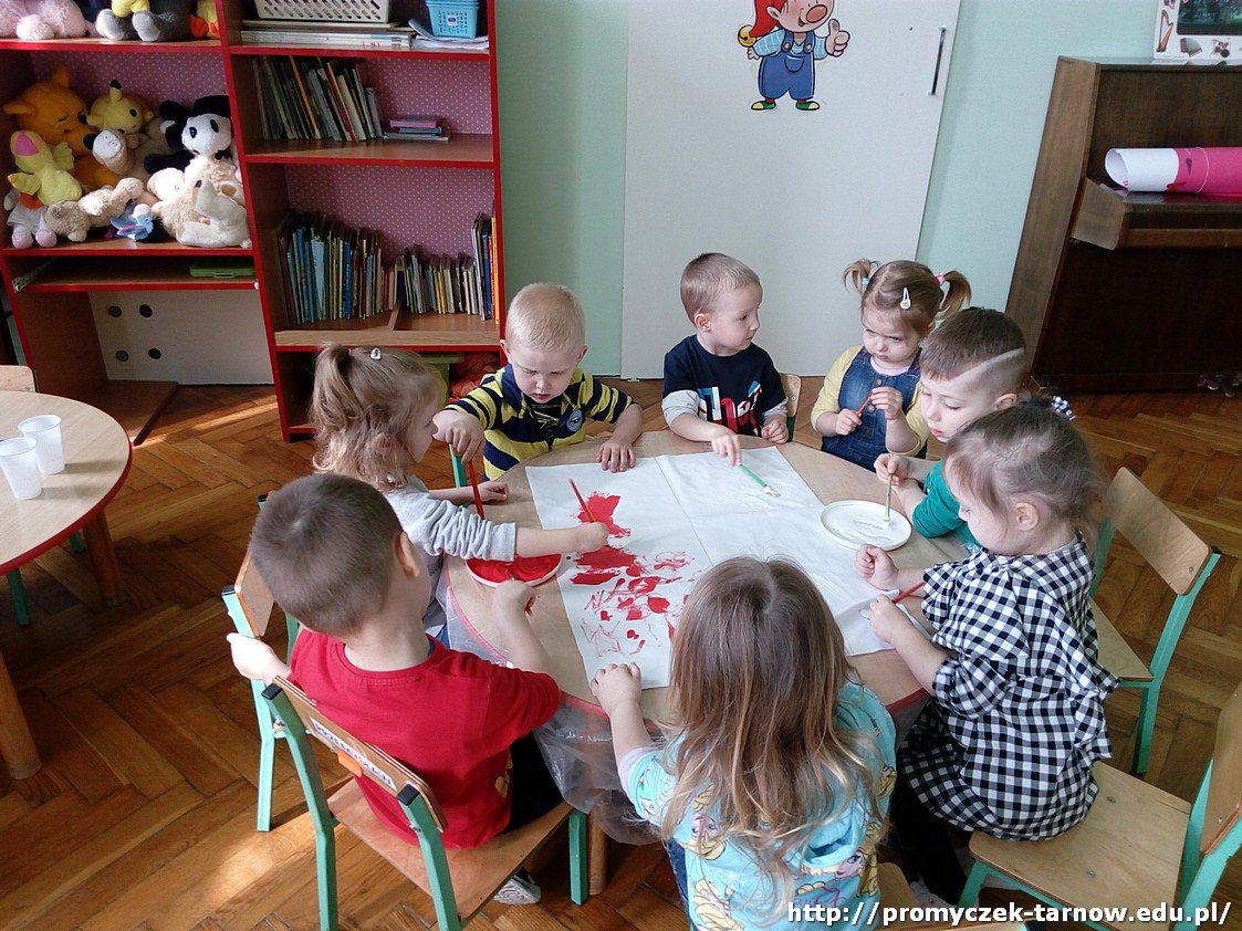 Pomimo, że pierwszy tydzień maja był niedługi, to z sali Smyków dało się odczuć zew patriotyzmu. Najmłodsze dzieci poznawały bowiem symbole narodowe, śpiewały pierwsze wesry Hymnu, a co więcej samodzielnie wykonały piękną flagę Polski na płótnie z użyciem farb.