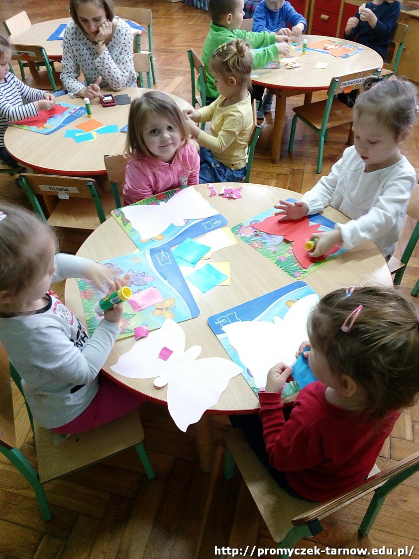 W drugim tygodniu grupę Smyków odwiedziły kolorowe motyle wykonane metodą wydzieranki z papieru. Prace można podziwiać na wystawie w przedszkolnym korytarzu.