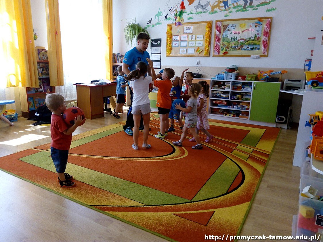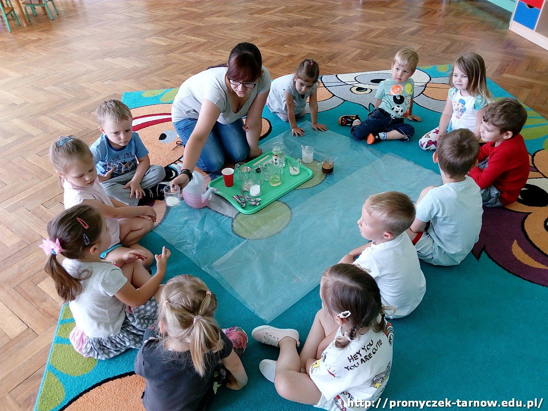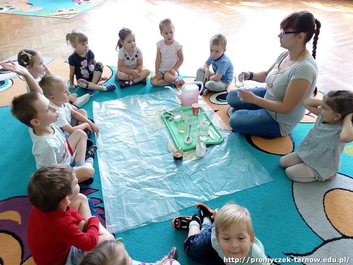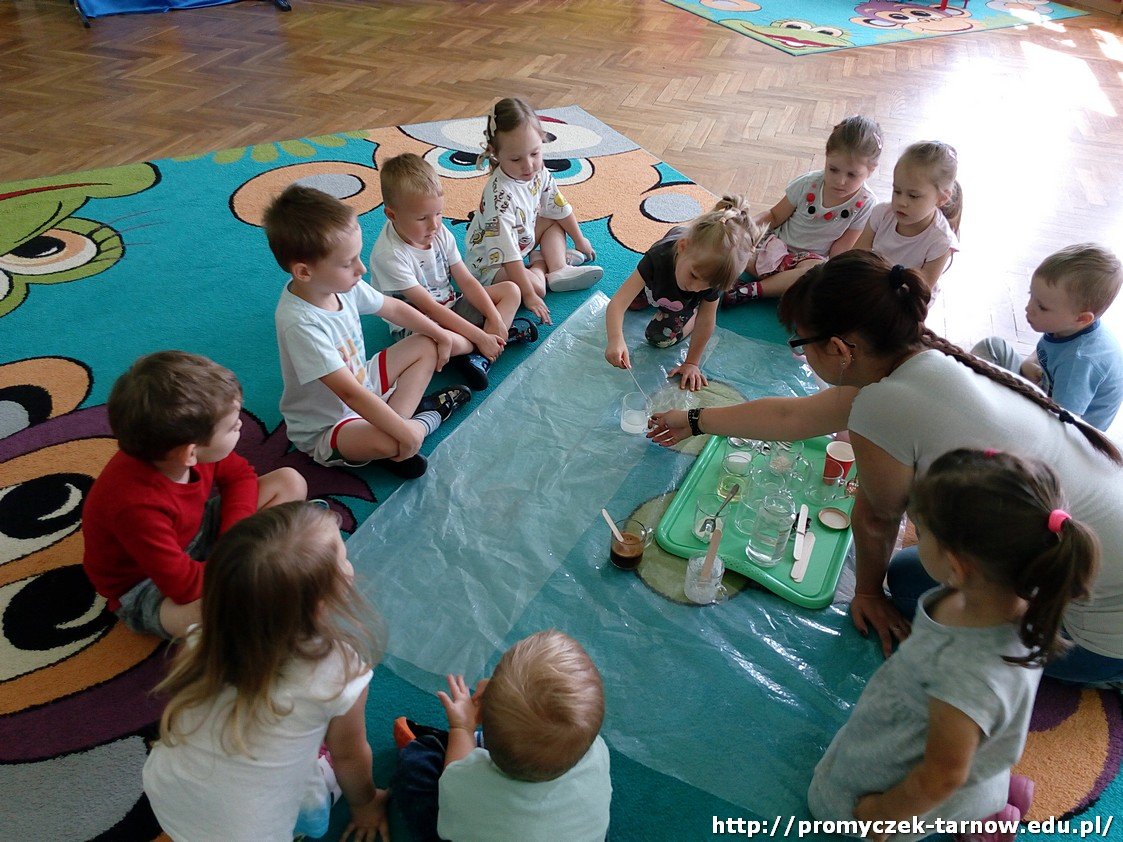 Wakacyjną porą pierwsza grupa Promyczka działa na pełnych obrotach. Dzieci spędzają czas na zabawie i eksperymentowaniu np. z wodą czy farbami, a jak tylko pozwala pogoda korzystają z placu zabaw ogrodu i spacerów po naszym urokliwym mieście. Nie mniej jednak wciąż utrwalane są zasady bezpiecznego spędzania wakacji oraz inne aspekty związane z okresem letnim.