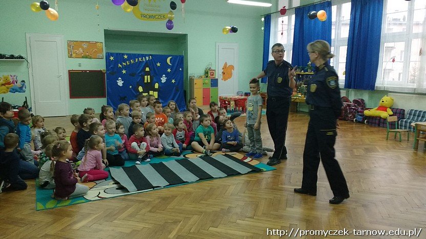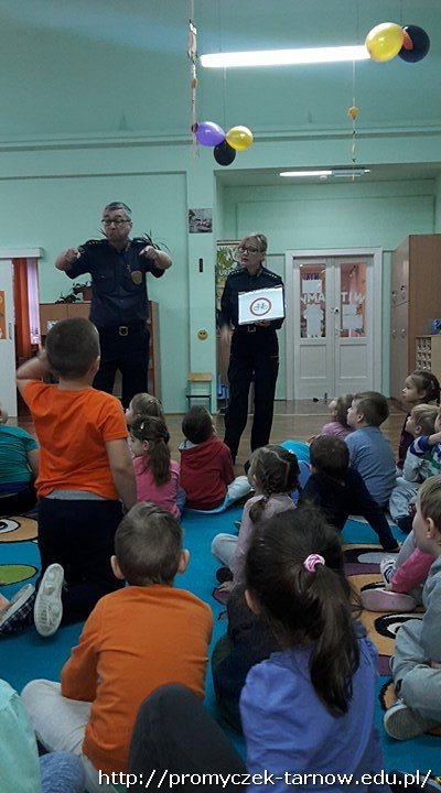 Ostatniego dnia listopada nasze przedszkole odwiedzili bardzo mili goście. Byli to pracownicy tarnowskiej Straży Miejskiej, którzy przybyli do nas z prelekcją na temat bezpieczeństwa.