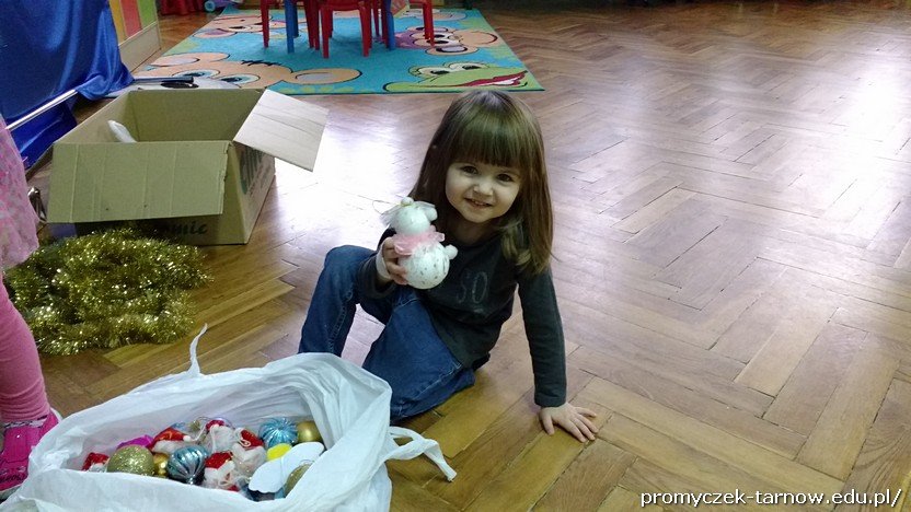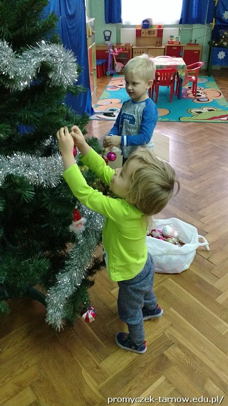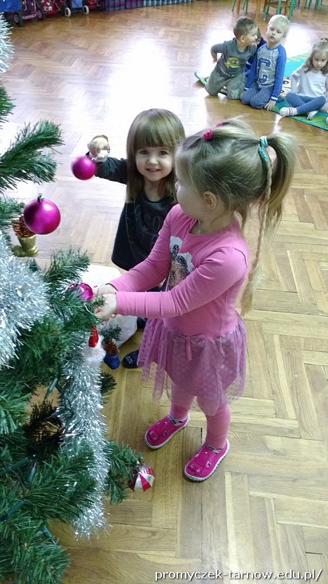 Po zajęciach nadszedł czas na ubieranie choinki. Przedszkolaki z zapałem przystąpiły do pracy, dzięki czemu rodzice odbierający dzieci po południu, mogli podziewać nasze piękne drzewko.