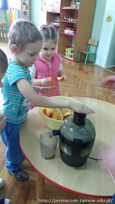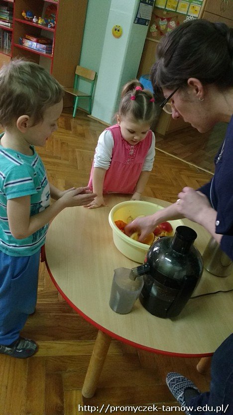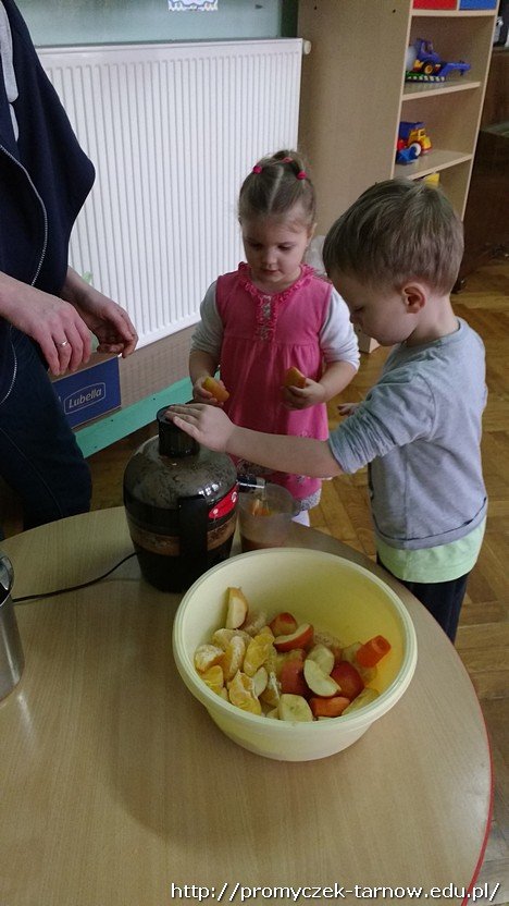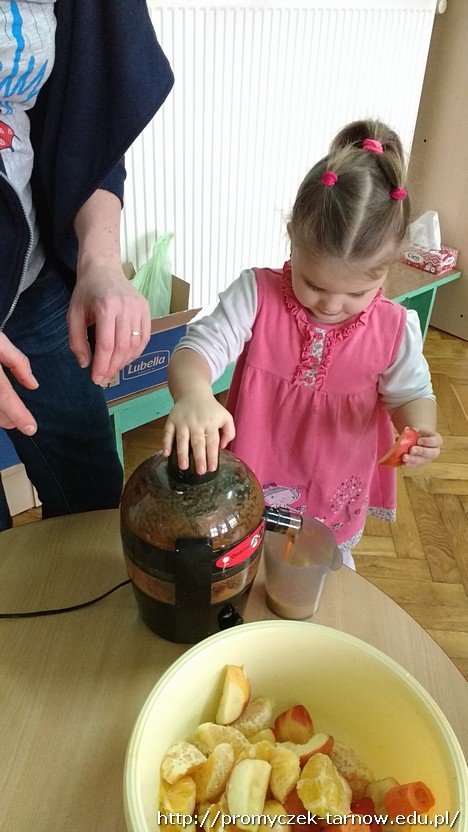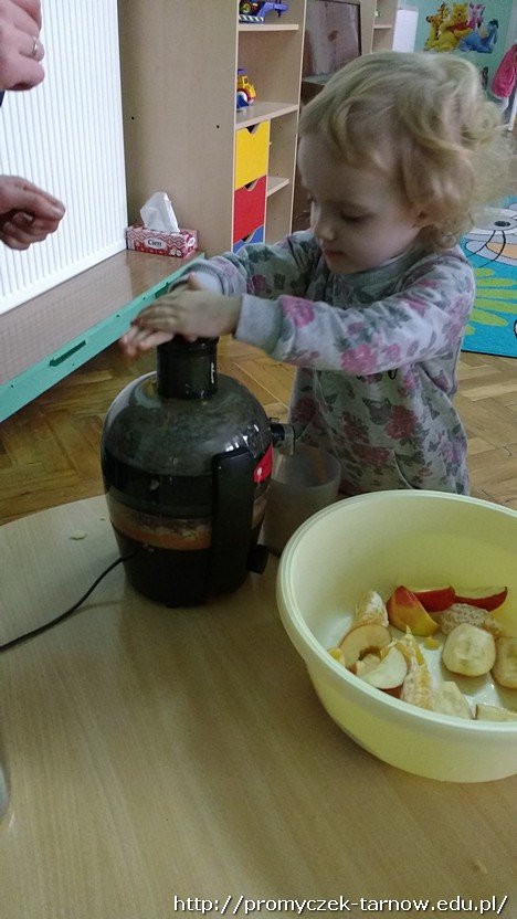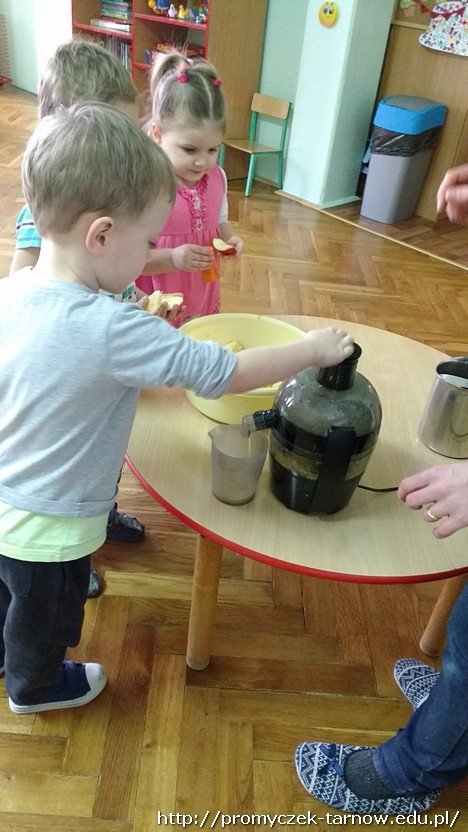 Smyki wrzucały czyste i pokrojone owoce do sokowirówki, ze zdumieniem obserwując ile pysznego soku powstaje z danej porcji. Efekt tych działań był niezwykle smaczny, o czym wszyscy przekonali się przy obiedzie – wtedy właśnie Smyki spróbowały swojego wyrobu.