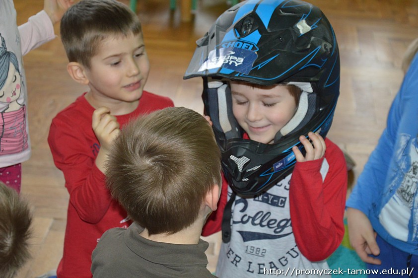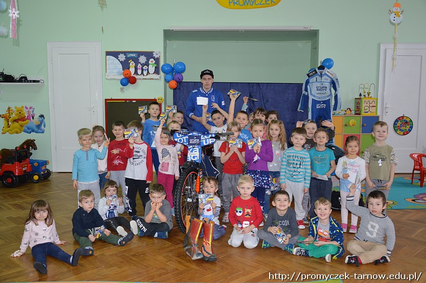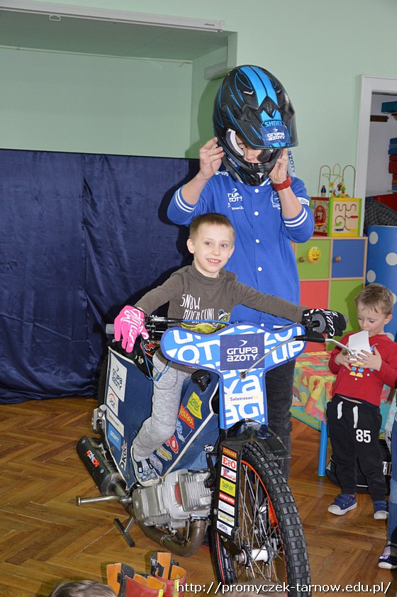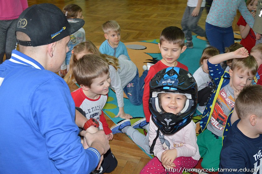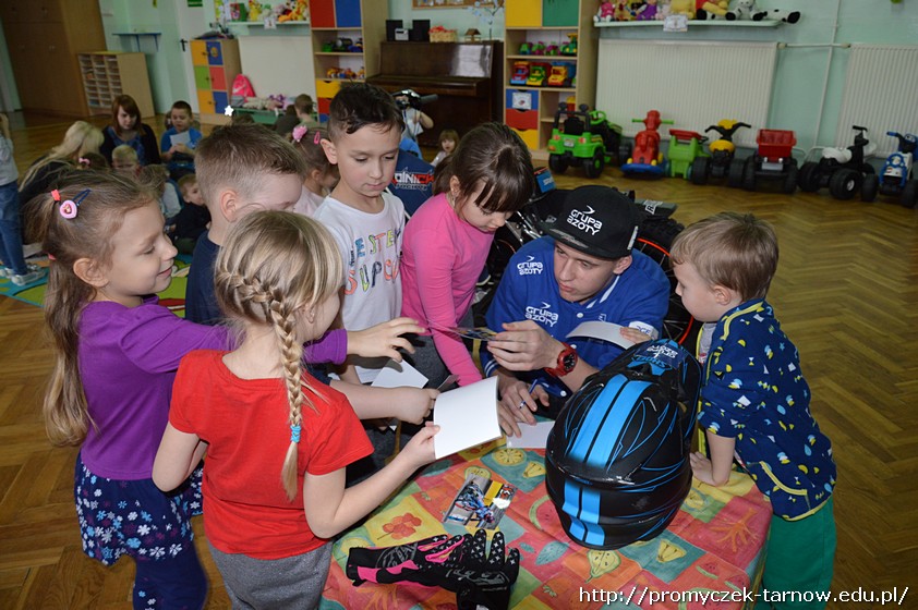 Nasze przedszkolaki były zachwycone spotkaniem! Z wielką radością słuchały wypowiedzi Krystiana na temat sportu, który uprawia, oglądały motor, przymierzały kask i rękawice. Co odważniejsi mogli nawet usiąść na motorze!