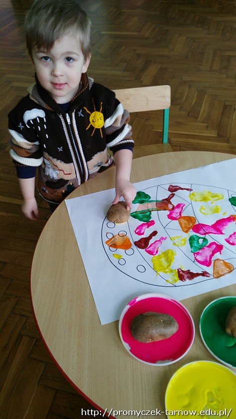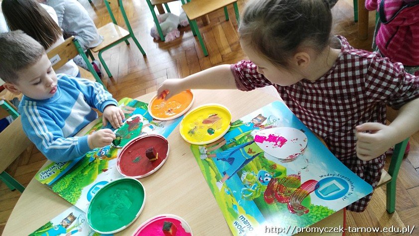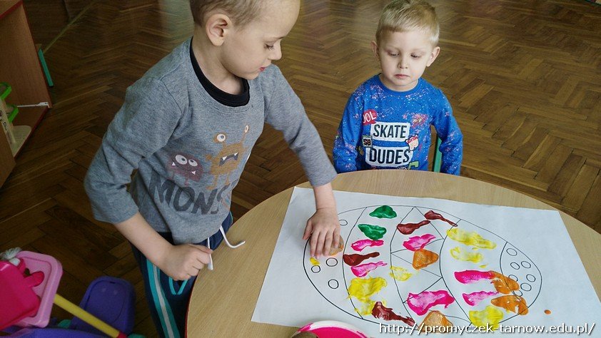 Wykorzystując mroźne przedpołudnia Smyki eksperymentowały z bibułą, farbami, gąbkami, a nawet i ziemniaczanymi stempelkami wdrażając się przy tym do zachowywania porządku na swoim stanowisku pracy.