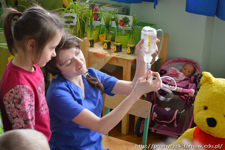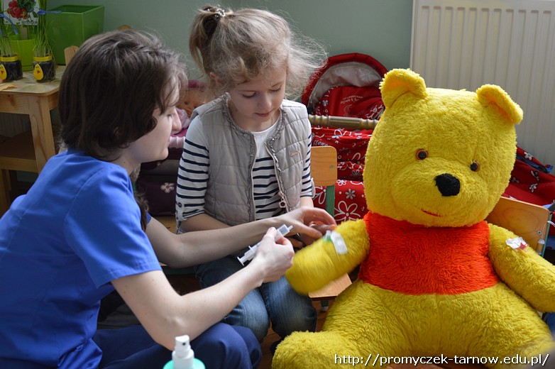 Nasi goście przygotowali trzy stacje, przy których dzieci mogły praktycznie i teoretycznie poznać poszczególne działania pielęgniarek. Przedszkolaki między innymi dezynfekowały i opatrywały rany, mierzyły temperaturę i ciśnienie swoim rówieśnikom oraz pluszowym „pacjentom”. Poza tym poznały sposoby działania w różnych sytuacjach zagrażających życiu i zdrowiu ludzi. Każda stacja dawała im mnóstwo radości i satysfakcji z samodzielnie wykonanych czynności.