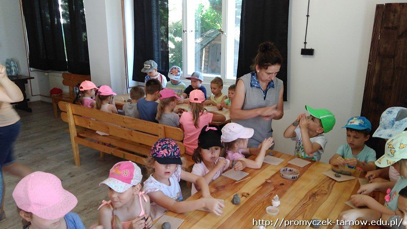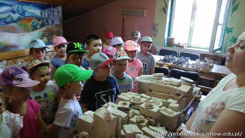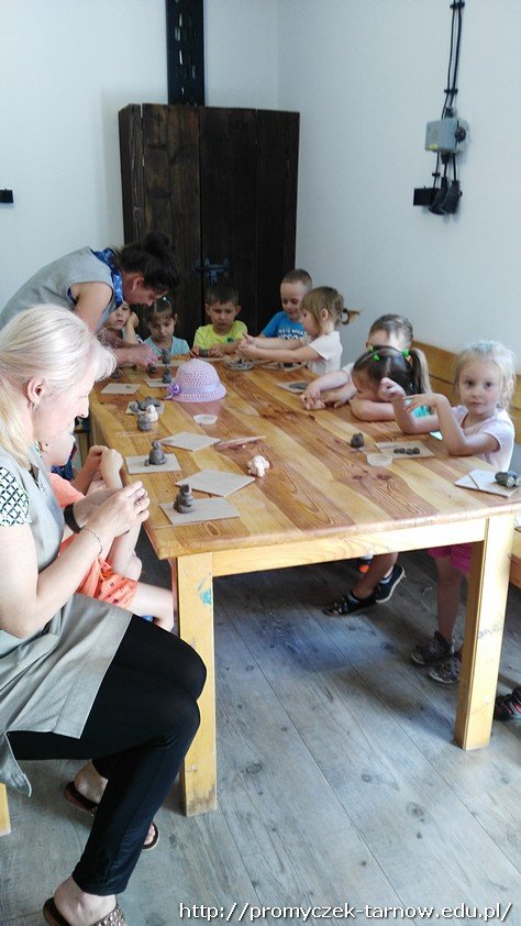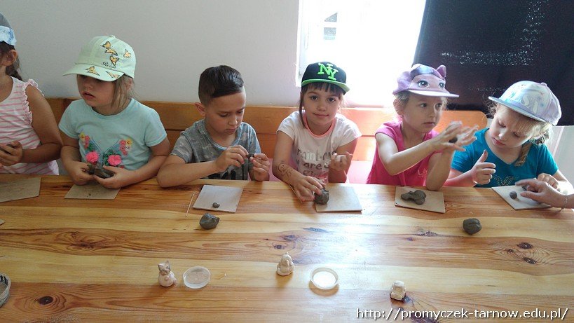 Chwilą odpoczynku okazały się warsztaty ceramiczne, na których wszystkie dzieci, z mniejszą lub większą pomocą pań, wykonały własnoręcznie figurki z gliny. Takie „legalne” brudzenie sprawiło im mnóstwo frajdy, a wykonane prace cieszyły oczy małych i dużych.
