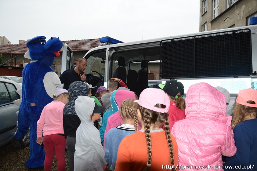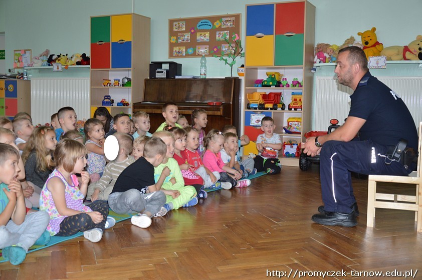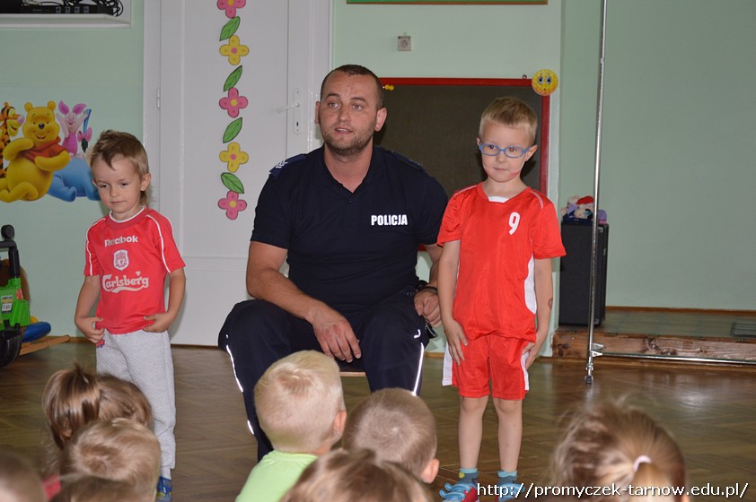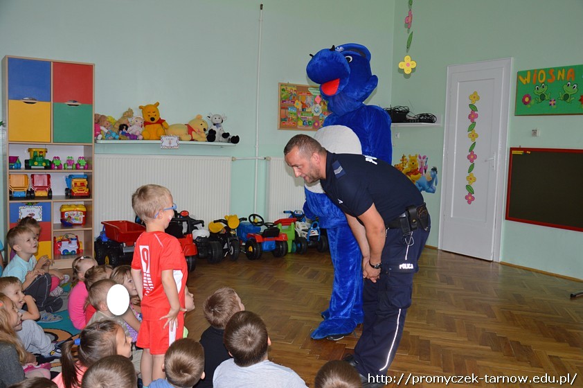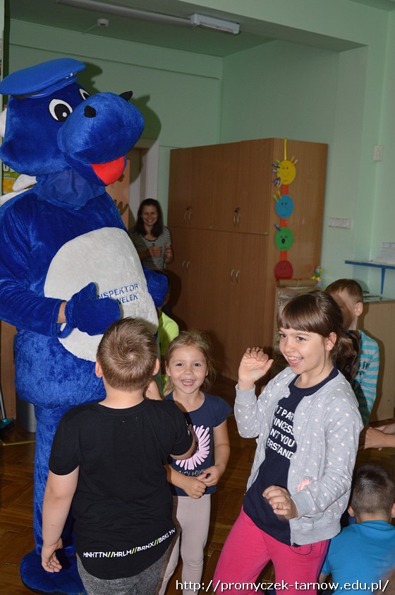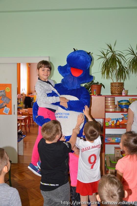 Duża już ilość wiedzy w tym zakresie jaka posiadały dzieci została uzupełniona praktycznymi radami i wskazówkami fachowca. Dodatkową atrakcją w czasie wizyty okazało się przyjście Inspektora Wawelka, który także zapoznawał dzieci z zasadami bezpieczeństwa.