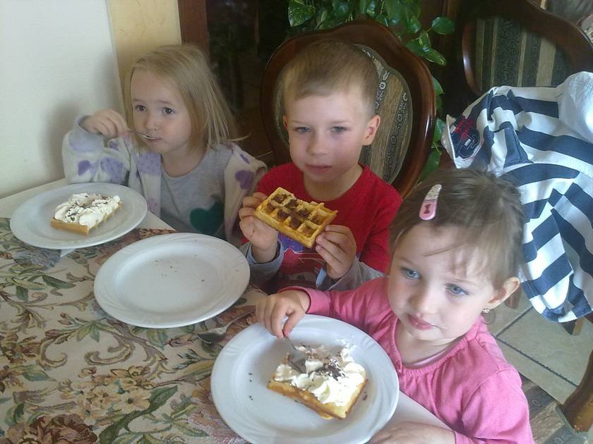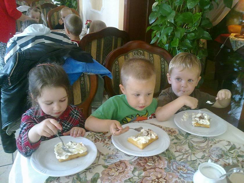 Pierwsza z nich odbyła się we środę - 25 czerwca 2015 roku. Maluchy wraz z panią Ulą, panią Danusią oraz panią Anią wybrały się do ... Kawiarni Tatrzańskiej na gofry! Dzieci zachowywały się bardzo kulturalnie, ponieważ dobrze wiedzą, co wypada ( a także czego nie wypada) robić w miejscach publicznych.