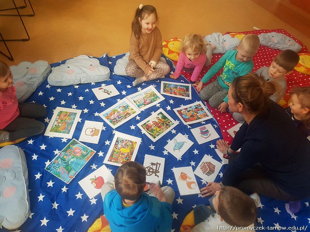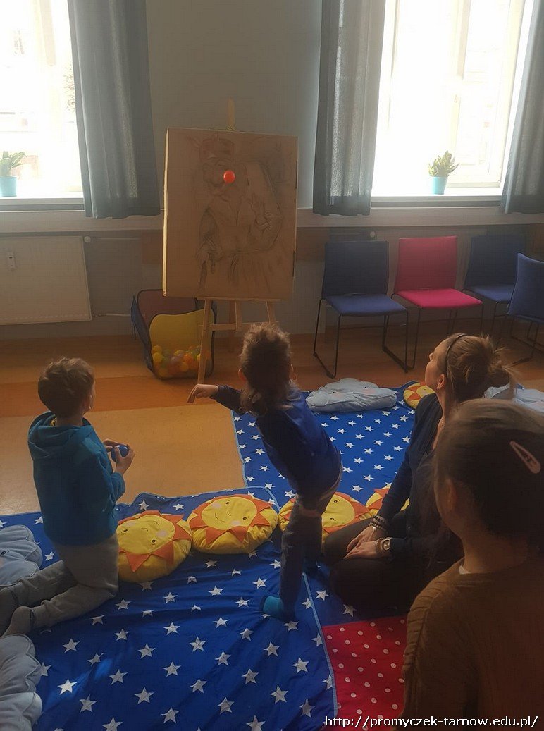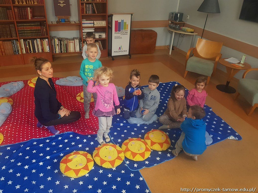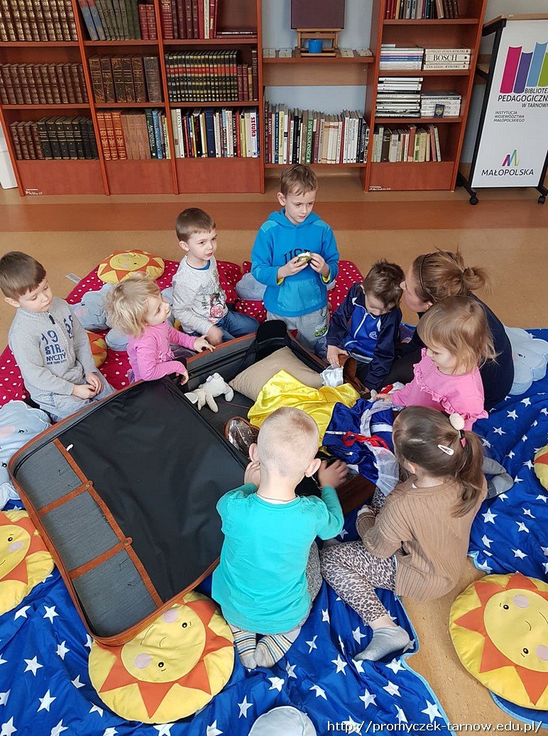 Przedszkolaki wzięły udział w zajęciach czytelniczych, podczas których mogły sprawdzić swoją znajomość baśni i bajek. Rozwiązywały zagadki i rozpoznawały tytuł bajki po rekwizytach wylosowanych z tajemniczej walizki. Dodatkową atrakcją była zabawa z piłeczkami "Baba Jaga".