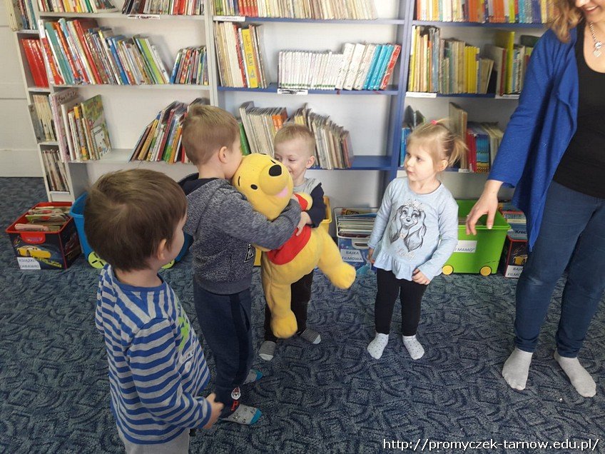 Czas spędzony w bibliotece uznajemy za bardzo owocny, nie obeszło się bez zabaw, które Smyki tak bardzo uwielbiają. Na zakończenie wysłuchaliśmy bajki o Kubusiu Puchatku, który wyczekiwał wiosny.