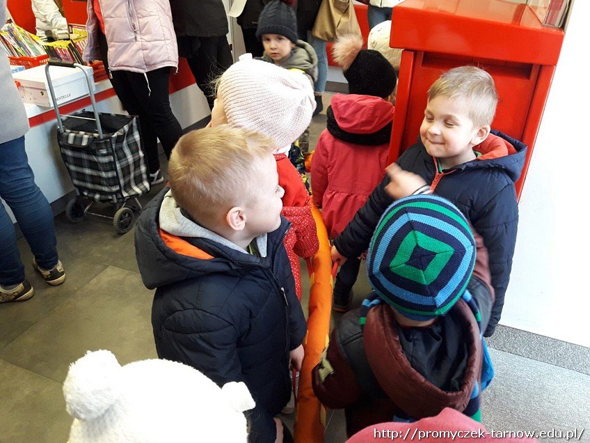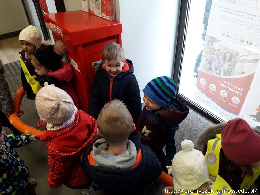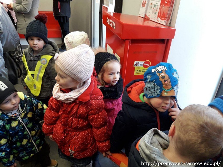 We środę - 20 marca - najmłodsza grupa udała się na Pocztę Polską z bardzo ważną przesyłką do wysłania, a mianowicie z pieniędzmi zebranymi z akcji "Góra Grosza" . Smyki cierpliwie czekały w kolejce do wysłania paczki.