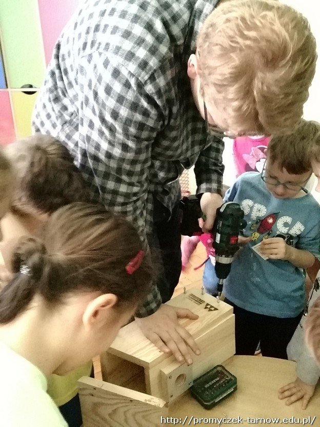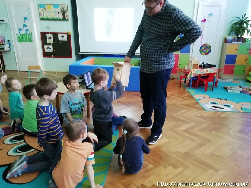 Tym razem, posiłkując się prezentacją multimedialną, opowiedział dzieciom o wybranych ptakach żyjących w naszym regionie oraz o budkach lęgowych specjalnie dla nich przygotowanych. Zuchy wspólnie z gościem zbudowały nawet taką budkę, która zawisła na drzewie na placu zabaw.