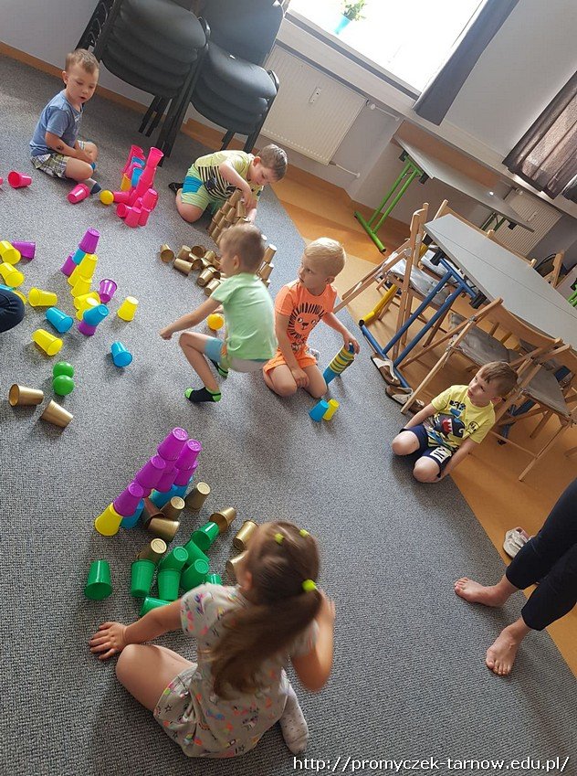 Kolejnym etapem warsztatów było odtworzenie z narysowanego kodu wieży z kolorowych kubków, które później dzieci zbijały piłeczkami.