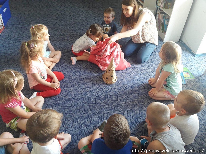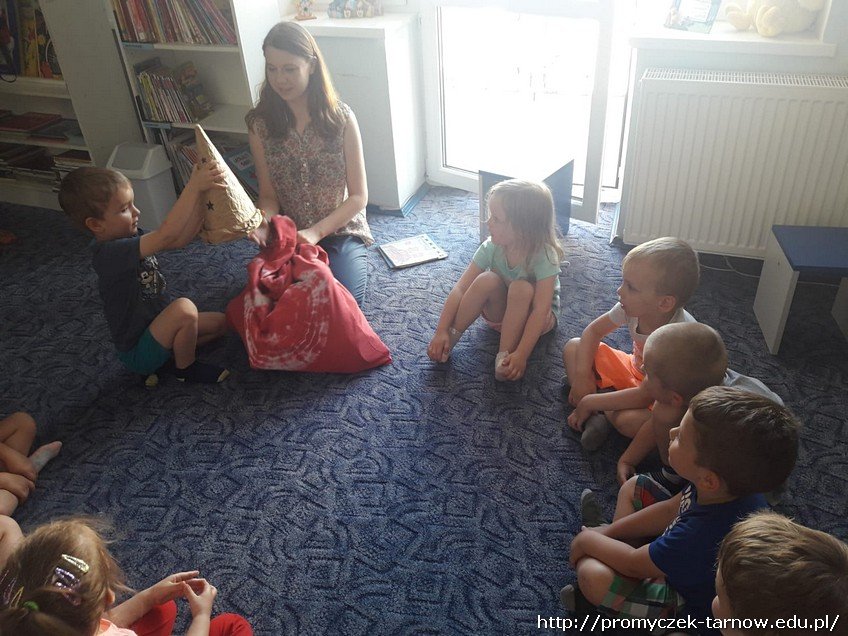 Przedszkolaki m.in.: pakowały plecak na wakacyjną wycieczkę, odgadywały dźwiękowe zagadki, łowiły " złote rybki" oraz wygrzewały się na "ciepłej plaży" na bibliotecznym dywanie.