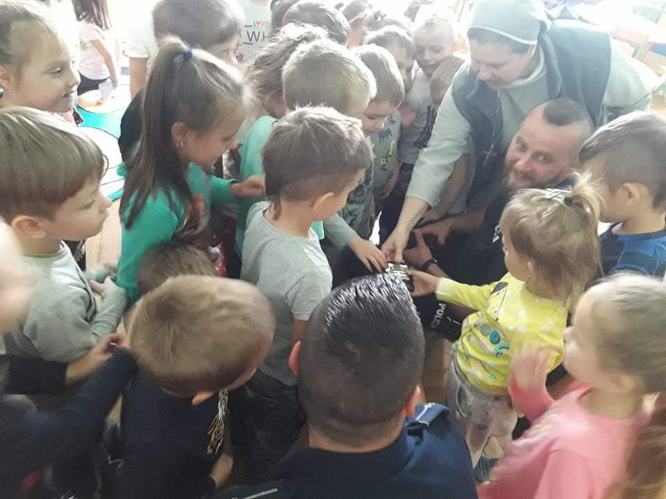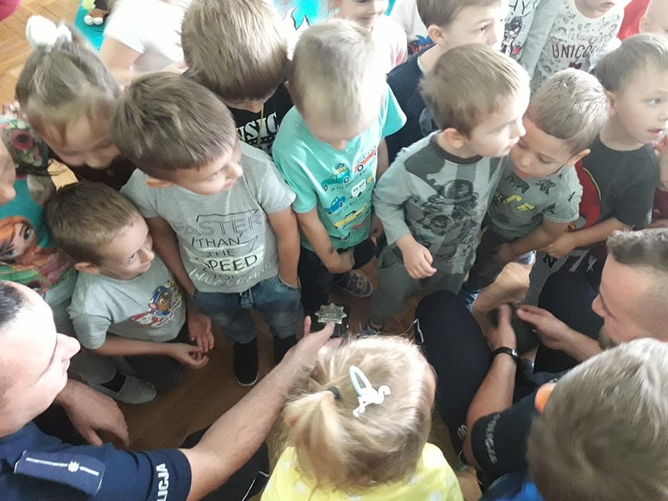 Dnia 18 wrzesnia w naszym przedszkolu pojawili sie bardzo ważni goście-policjanci. Panowie tego dnia opowiedzieli nam o zasadach bezpiecznego poruszania się po chodniku i drodze. Przypomnieli, że przez pasy zawsze przechodzimy z osobą dorosłą i na zielonym świetle. Dodatkowo mielismy okazje dowiedziec się o zawodzie i pracy policji. Pan policjant opowiedział jak wygląda ich dzień w pracy i czym sie zajmują. Dzieci teraz wiedzą, że mundur policyjny nie jest tylko w kolorze granatowym ale również w czarnym. Zostaly zaprezentowane kajdanki oraz odznaki Panow Policjantow! Dziękujemy serdecznie za lekcje o bezpieczenstwie oraz wprowadzenie podstawowej wiedzy o wygladzie pracy w policji.