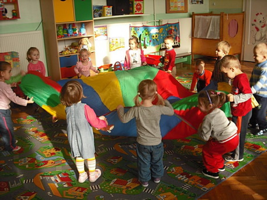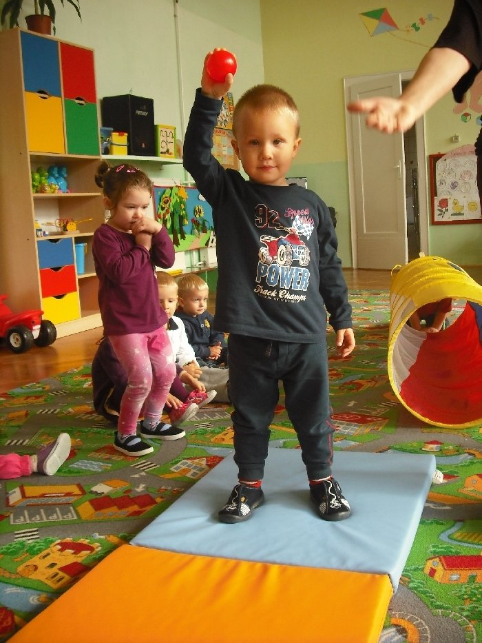 Nie tylko średniaki i starszaki uczestniczą w zajęciach kółka sportowego, maluchy również! Pod czujnym okiem pani Uli i pani Danusi, Smyki ćwiczyły koordynację ruchową oraz usprawniały funkcje dużej motoryki. Najwięcej frajdy sprawiło dzieciom przechodzenie przez tunel. Nie lada niespodzianką były również zabawy z chustą animacyjną