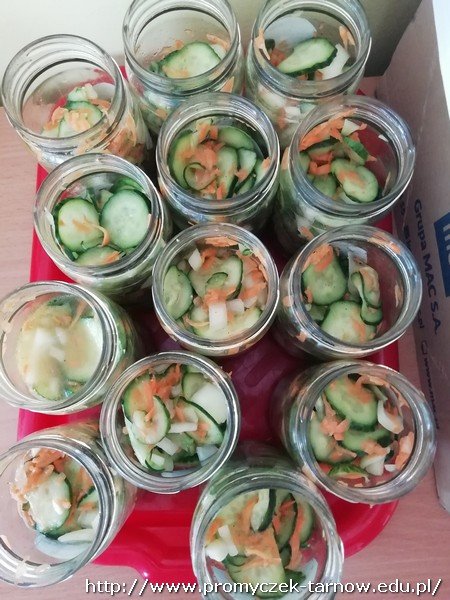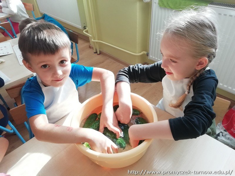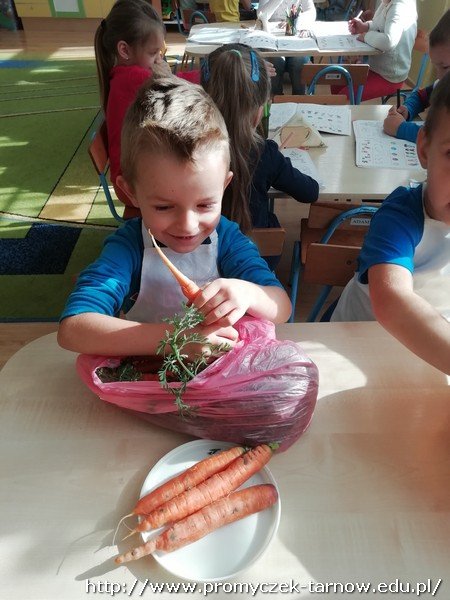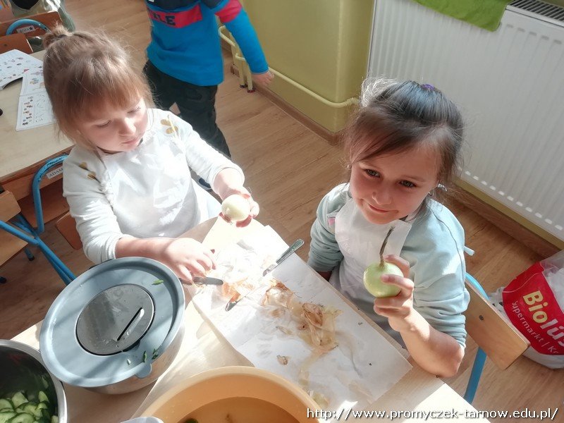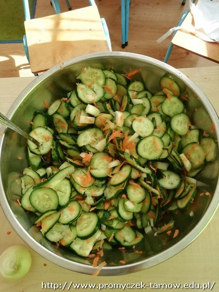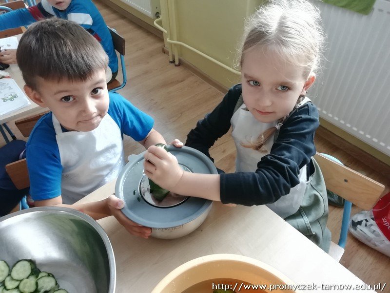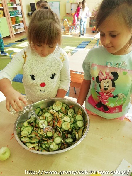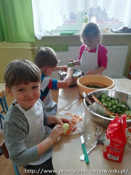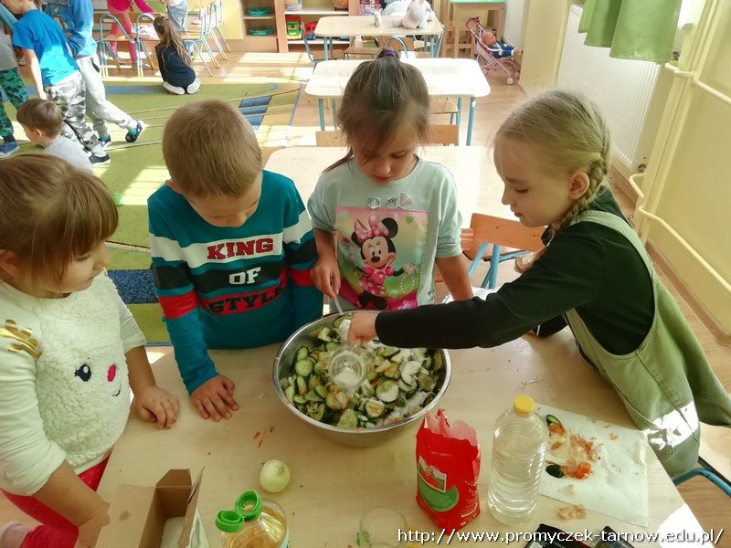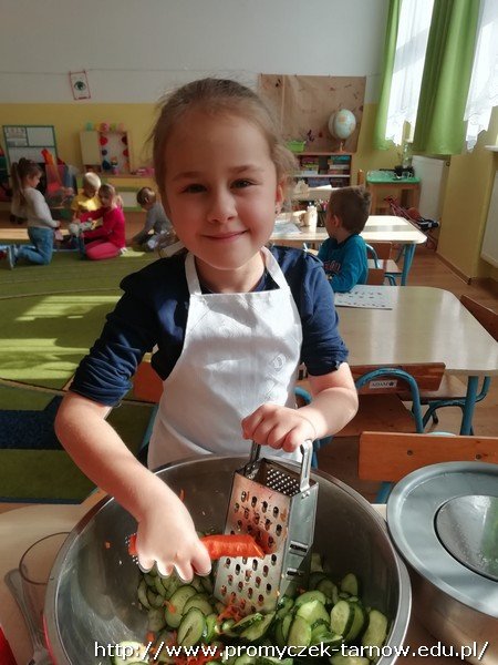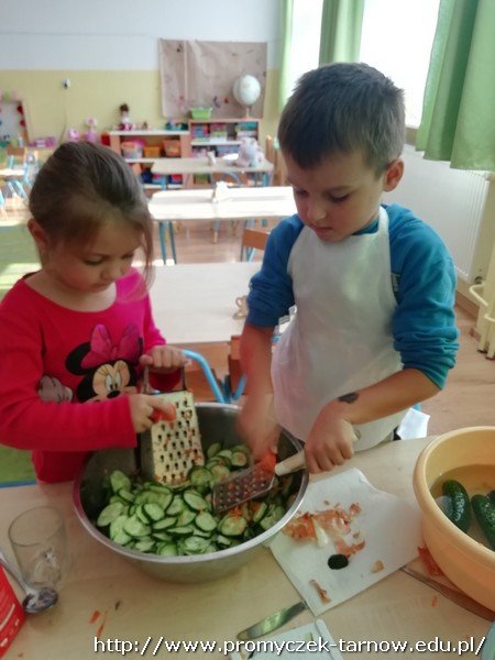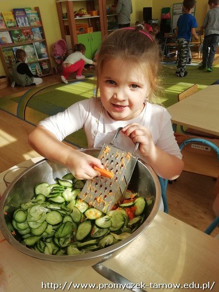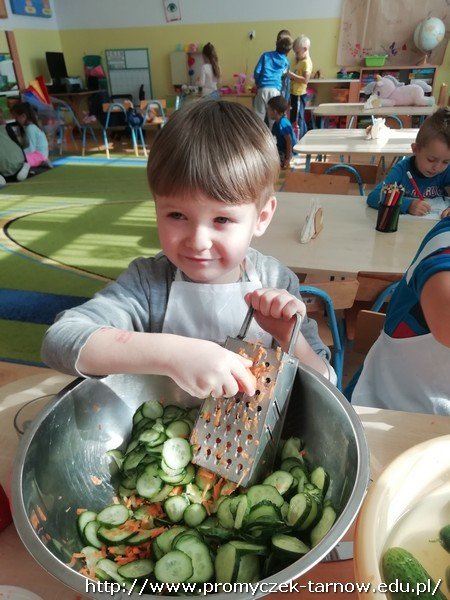 Jesień przyszła, a więc zima tuż tuż i trzeba pomyśleć o robieniu zapasów, dlatego Zuchy też zabrały się do pracy. Z ogórków, marchewki i cebuli, pod okiem swoich pań, zrobiły pyszną sałatkę obiadową. Dzieci tarły, kroiły, ścierały i obierały warzywa bardzo ostrożnie, bo wiedzą, że nie wolno bawić się ostrymi narzędziami bez opieki dorosłego. I wiecie co, wychodziło im to bardzo sprawnie. W rezultacie sałatka była pyszna, a jej zapach unosił się w całym przedszkolu.