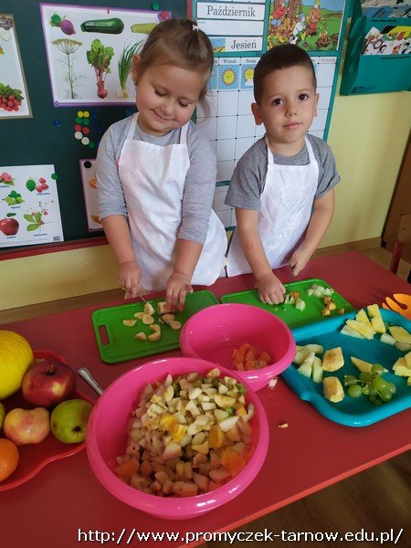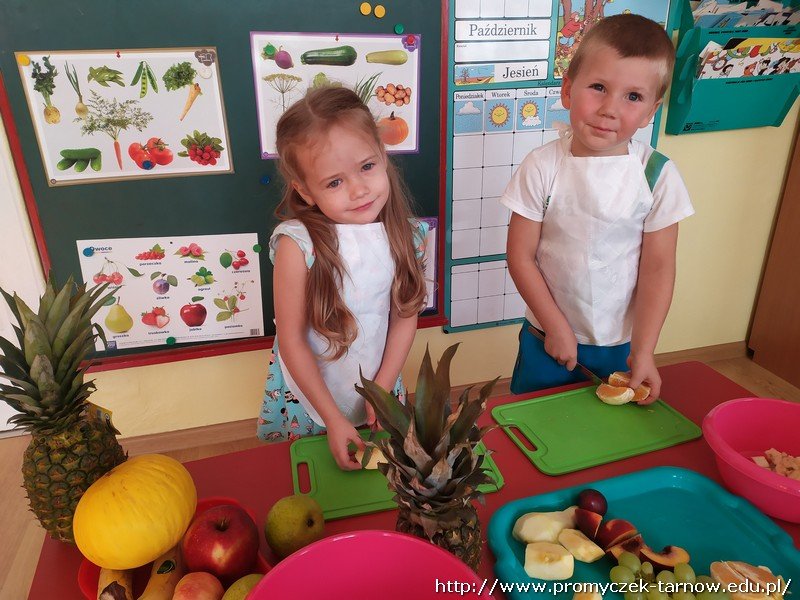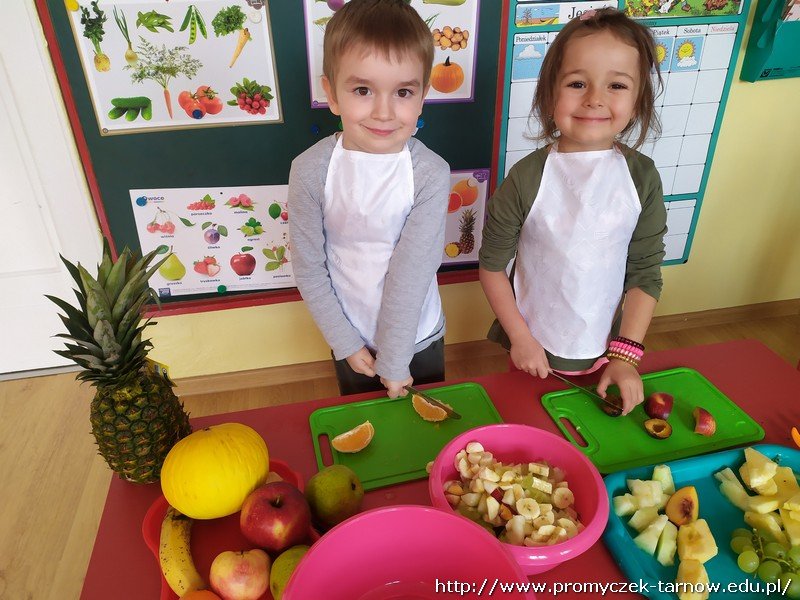 Najpierw oczywiście musieliśmy przypomnieć sobie nazwy przyniesionych owoców, przygotować je, a następnie wszyscy ochoczo zabrali się do krojenia. Sałatka wyszła wspaniale - było pysznie, kolorowo i zdrowo!