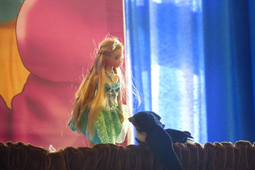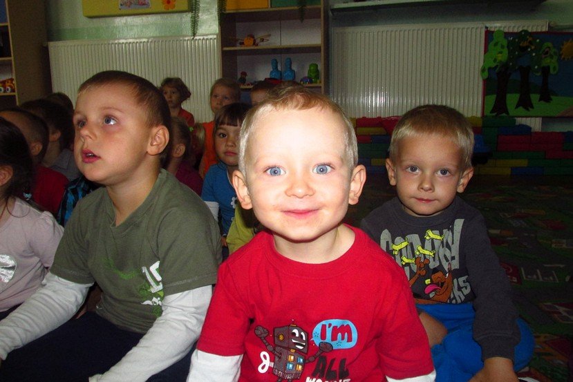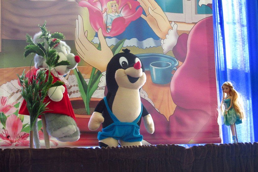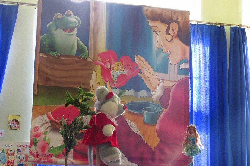 Wszystkie grupy zgromadziły się w sali Smyków i wygodnie rozsiadły na dywanie. Po krótkim przywitaniu przedstawienie rozpoczęło się! Jak się okazało była to piękna bajka „Calineczka”, która bardzo przypadła do gustu naszym maluchom.