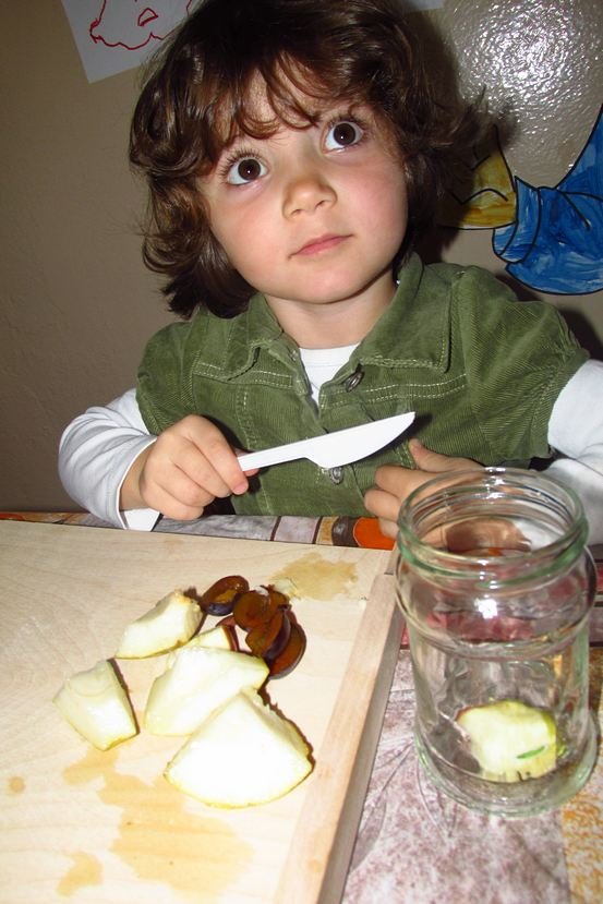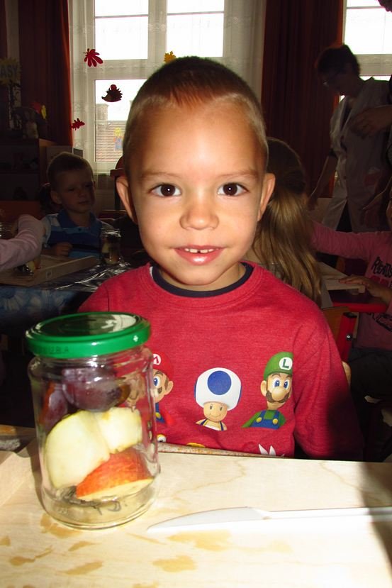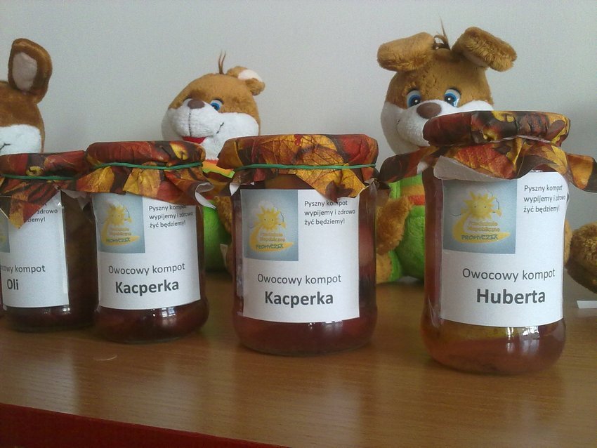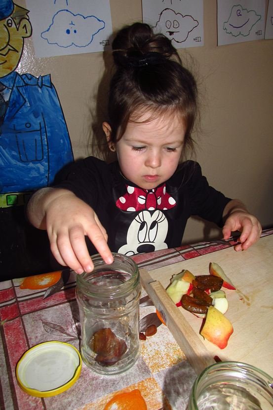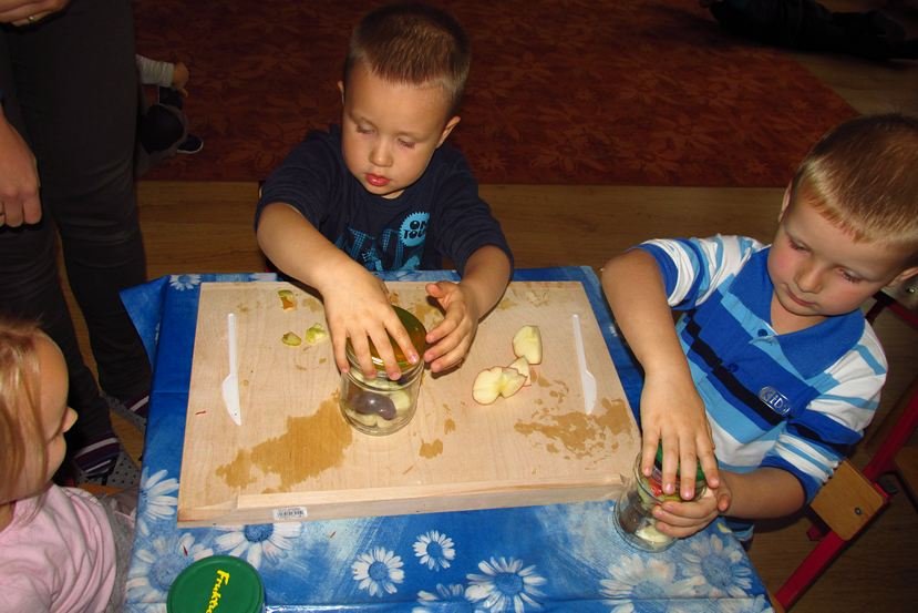 Przygotowywanie kompotów rozpoczęło się od gruntownego umycia jabłek, gruszek i śliwek. Następnie przedszkolaki dostały plastikowe nożyki i kroiły swoje owoce. Każdy, kto miał problem, mógł liczyć na pomoc pani Ani i pani Pauliny. Gdy owoce wylądowały w słoikach, nadszedł czas na posypywanie cukrem i zalewnie słoików wodą. Pani Ania i pani Ula tradycyjnie już zajęły się pasteryzowaniem przetworów. Wierzymy, że kompot przygotowany z takim zaangażowaniem będzie najlepszy i najzdrowszy na świecie!