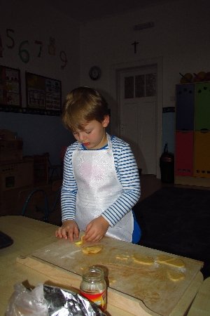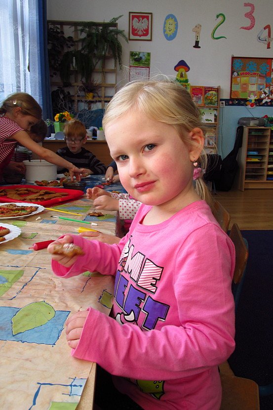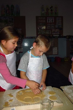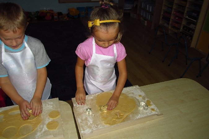 Tematem zajęć było nakrywanie do stołu i pieczenie ciasteczek. Właśnie ciasteczkami zajęliśmy się na początku. Nasza droga pani Renatka z kuchni przygotowała rano smakowite kruche ciasto. Każdy otrzymał kawałek, który sam rozwałkował i wyciął kształty przy pomocy specjalnych foremek. Potem nastąpiło przyozdabianie ciasteczek cukrem i cynamonem, oraz tworzenie nadziewanych jabłkiem pierożków.
