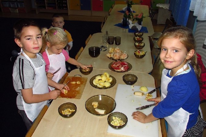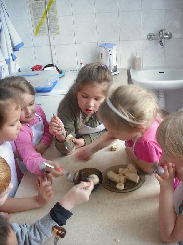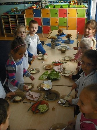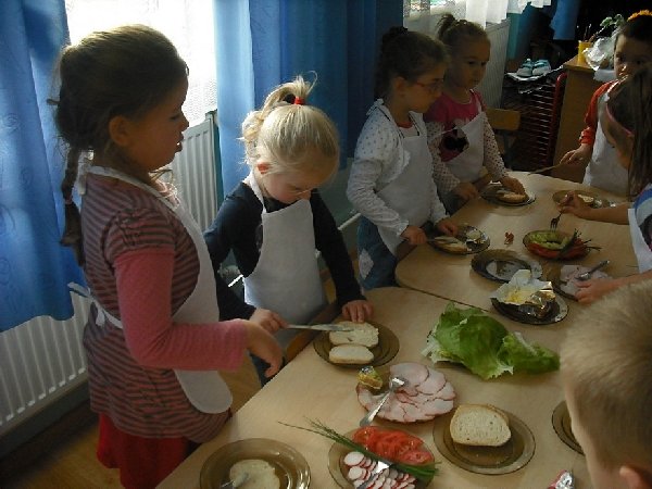 14 listopada 2013 roku kółko kulinarne „Mali Smakosze” realizowało na swoich zajęciach temat „Wesołe i zdrowe kanapeczki”. Na początek wszyscy solidnie przygotowali się do pracy: dzieci przy pomocy pani założyły fartuchy, każdy wybrał sobie miejsce do działania, odbyła się krótka pogadanka na temat bezpieczeństwa i higieny przy wykonywaniu tego typu czynności.
