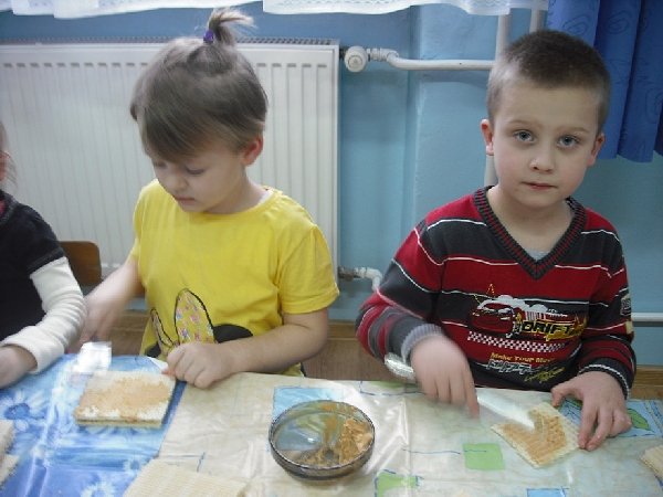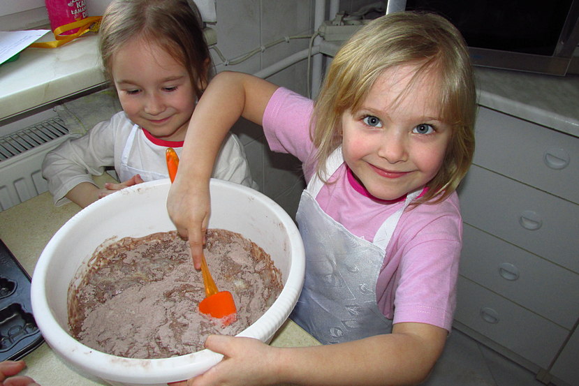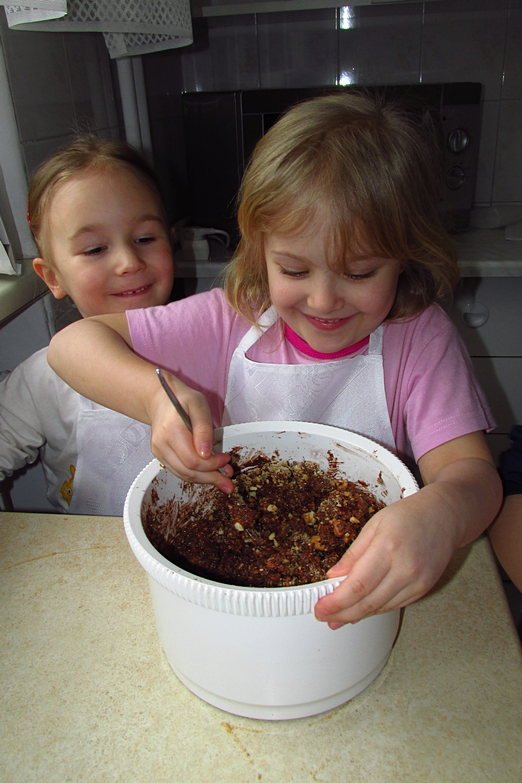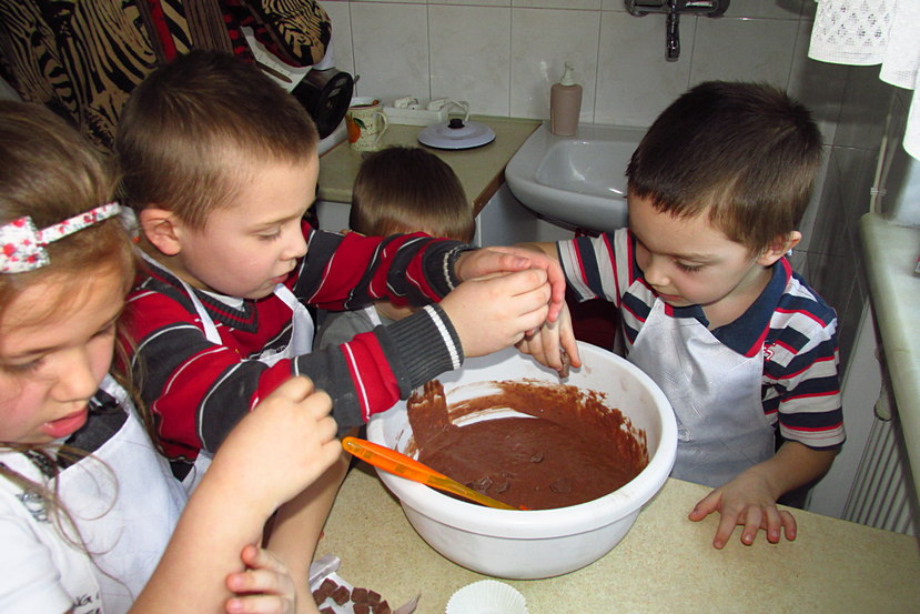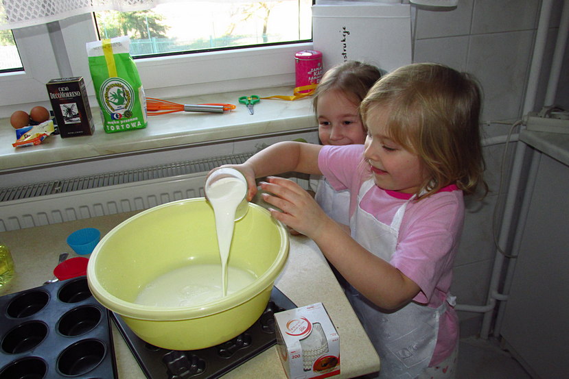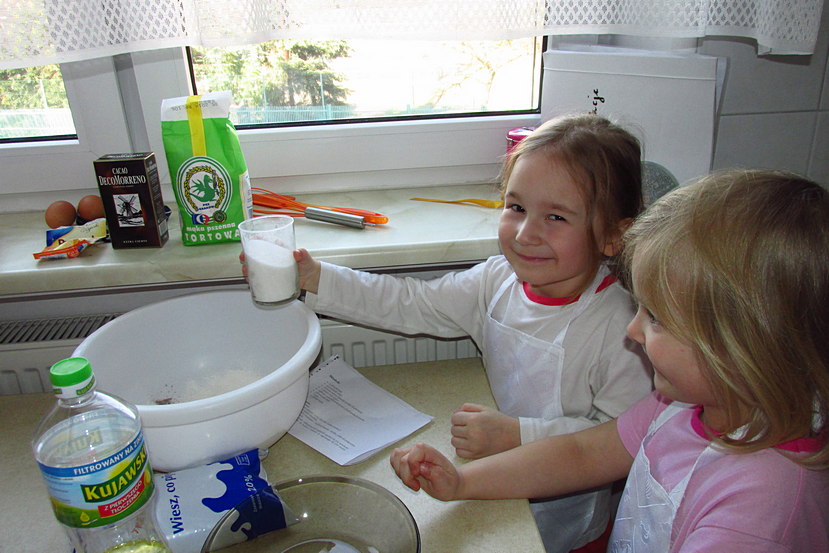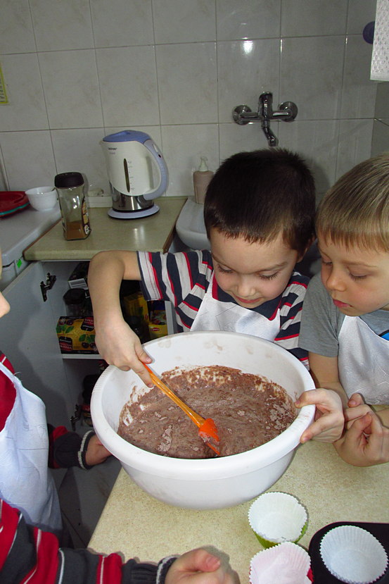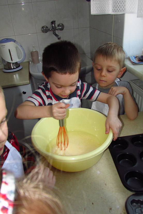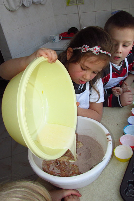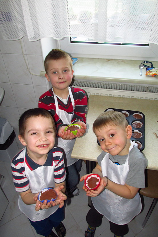 Dzieci ochoczo zabrały się do pracy. Najpierw wszyscy ustalili co będzie potrzebne do upieczenia babeczek. Pani Ul powiedziała, że przygotowane produkty należy podzielić na składniki na „suche” oraz „mokre” i umieścić je w oddzielnych miskach. Następnie każdy mieszał ile sił w małych rękach tak, aby produkty w obu naczyniach połączyły się. Kolejnym krokiem było dodanie „mokrych” składników do „suchych” i wymieszanie ich, ale tylko do połączenia zawartości obu naczyń. Gdy smakowicie pachnąca masa była gotowa dzieci dodały do niej pokruszoną czekoladę, a następnie napełniały słodką zawartością foremki do babeczek.