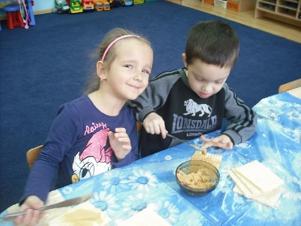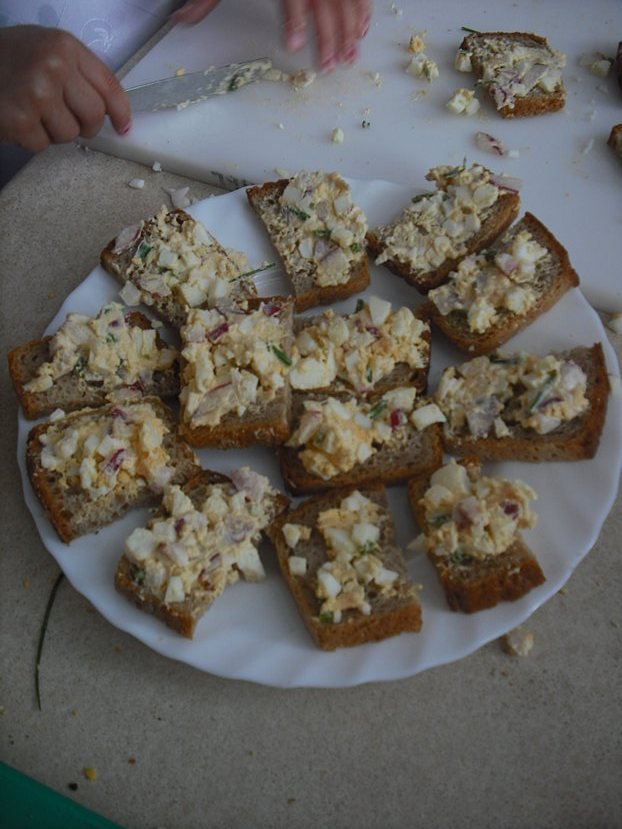 Na początek zajęliśmy się oczywiście tematem śniadaniowym. Już Smyki wiedzą, że śniadanie to najważniejszy posiłek dnia - wiele zależy od niego, np. to, jak będziemy funkcjonować aż do wieczora. My postanowiliśmy przygotować smaczne pasty, które może jeść ze smakiem cała rodzina. Podczas zajęć każdy miał własny przydział prac: niektóre dzieci kroiły białko, inne rozdrabniały żółtko, jeszcze inne kroiły szczypiorek i rzodkiewkę. Następnie wszystkie składniki połączyliśmy ze sobą, dodając niewielką ilość majonezu. Na koniec troszkę przypraw i już można było smarować ulubione pieczywo. Okazało się, że nasze kanapeczki wyszły wyśmienite! Każdy zajadał się nimi ze smakiem.
