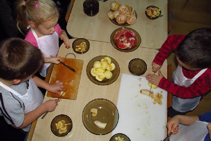 Każde dziecko otrzymało fartuszek, bezpieczny nóż oraz miseczkę na owoce. Do wyboru były soczyste pomarańcze, lekko kwaśne grejpfruty, słodkie jabłuszka oraz smakowite banany. Każdy chciał pokroić jak najwięcej owoców, aby jego sałatka była bogata w składniki.