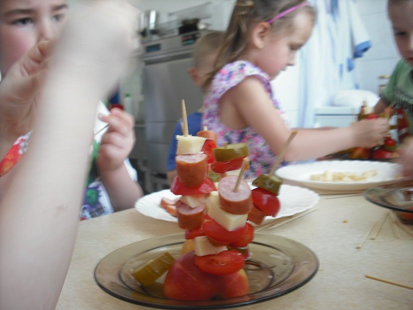 Szaszłyki okazały się bardzo dobrym pomysłem. Powstają one w mgnieniu oka, a efekt cieszy nie tylko małych, ale i dużych. Jak zwykle naszymi specjałami poczęstowaliśmy dzieci i pracowników Przedszkola Niepublicznego „Promyczek” i (nie chcemy się chwalić), ale usłyszeliśmy wiele miłych słów na temat naszych kulinarnych dzieł sztuki. Mamy nadzieję, że naszym rodzicom również będą smakować!