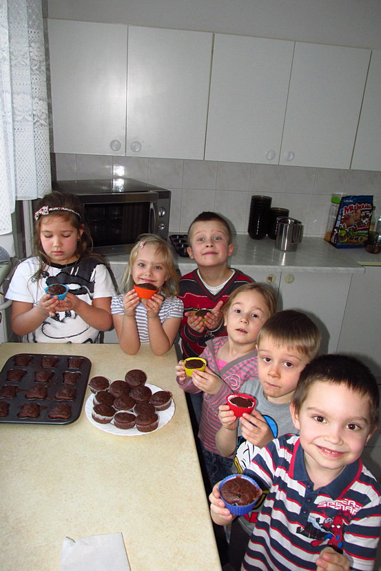 I tu nastąpił najgorszy etap – oczekiwanie, aż babeczki się upieką! Na szczęście potrzebowały tylko 15 minut i po chwili mogliśmy się delektować wspaniałym smakiem. Oczywiście nie zapomnieliśmy o paniach pracujących w przedszkolu i innych dzieciach. Każdy miał 13 marca 2014 roku małą czekoladową przyjemność.