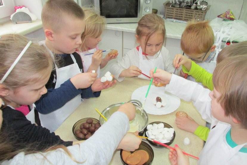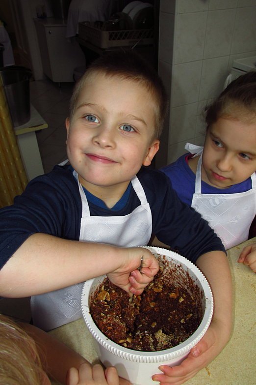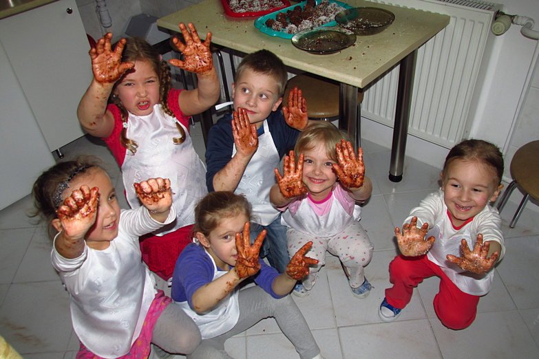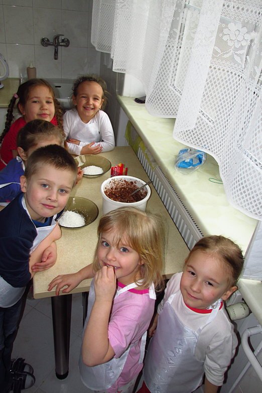 Tym razem na zajęciach przygotowaliśmy coś, co wszystkie dzieci uwielbiają – kuleczki czekoladowe! Przepis jest bardzo prosty – wystarczą herbatniki, masło, kakao i jajka, troszkę pracy, a efekt zadowoli każdego. Zabawy było przy przygotowywaniu tych pyszności co niemiara, bo ręce kleiły się od masy, a w brzuchach burczało od wspaniałego zapachu. Niestety z próbowaniem kulek trzeba było nieco poczekać, bo muszą one kilka godzin spędzić w lodówce.