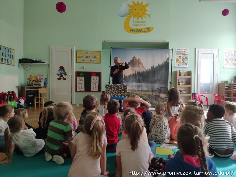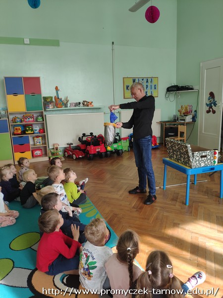 Nasze przedszkole w środę rano zamieniło się w bajkowe miejsce, a to wszystko za sprawą pana Magika, który zaprezentował dzieciom magiczne sztuczki. Przedszkolaki mogły zaobserwować jak czerwona chusteczka zamienia się w różdżkę. Następnie zmienia kolor po włożeniu do magicznej czapki, a także piłeczki, które po schowaniu w tubie pokazywały się w innej kolejności. Dzieci nie dowierzały własnym oczom i nie mogły pojąć jak to wszystko się dzieje. Zdradzę Wam, że Panie również miały nie lada zagwozdkę ;)