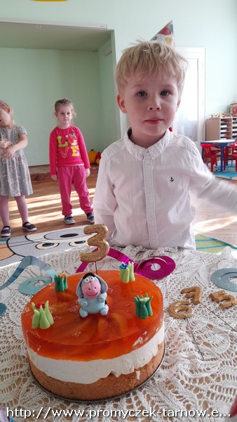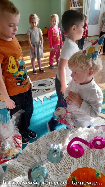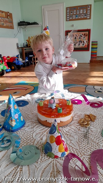 W październiku urodziny w naszym przedszkolu obchodziła czwórka dzieci - Julka, Leon, Karol i Franiu. Dla naszych jubilatów czekały małe upominki oraz smaczny tort. Po odśpiewaniu " Sto lat" i złożeniu życzeń promyczki udały się na spożycie torta do swoich sal. Wszystkim jubilatom życzymy radości z każdego dnia oraz wesołej zabawy urodzinowej!