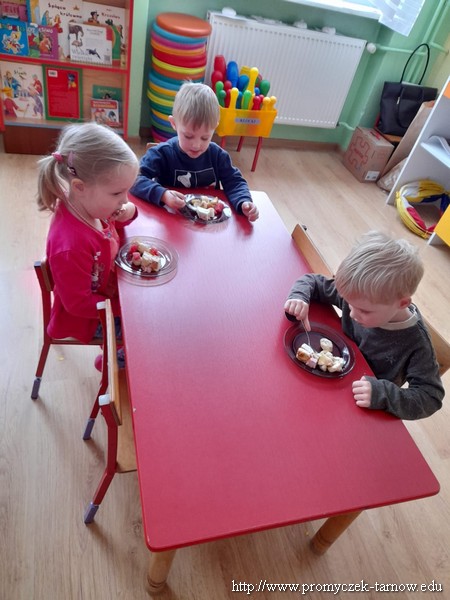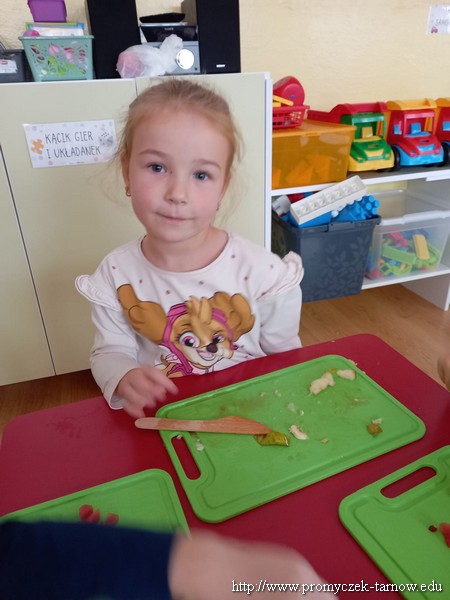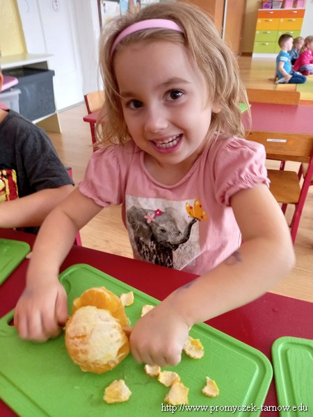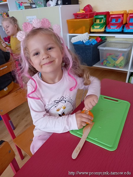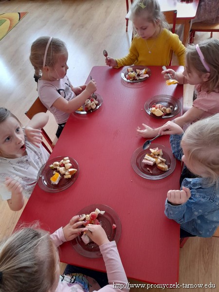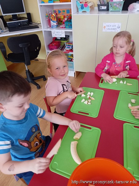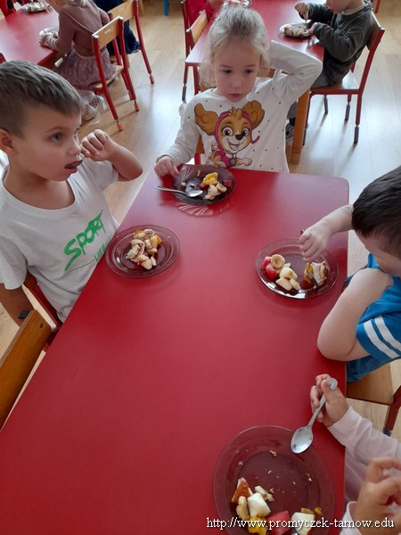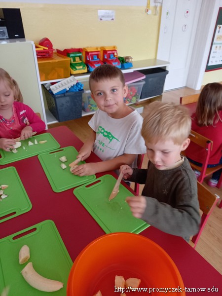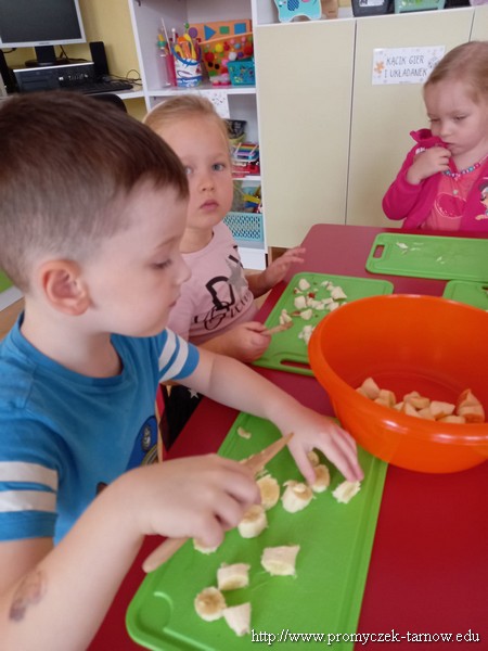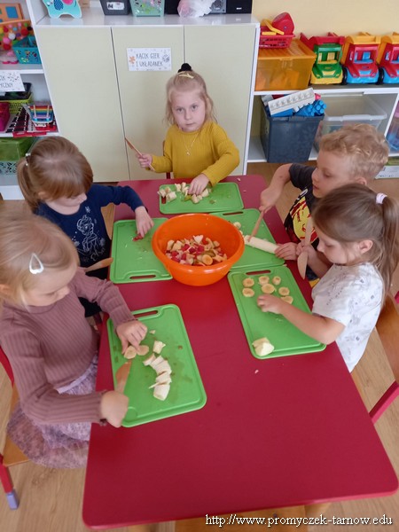 W ostatnim tygodniu września w przedszkolu królowała tematyka przybyłej do nas jesieni. Dzieci poznawały i utrwalały informacje o darach tej pory roku, próbowały ją scharakteryzować oraz posmakować. Asy przerabiając temat jesiennego sadu wykonały kompocik z jabłek z dodatkiem przypraw korzennych, takich jak goździki czy cynamon. Innym razem zaś dzieciaki przygotowały dla siebie słodki, ale bardzo zdrowy podwieczorek. Po przygotowaniu miejsc pracy, umyciu rąk, przypomnieniu zasad bezpieczeństwa w kuchni Asy rozpoczęły krojenie owoców na sałatkę owocową. Przysmak bardzo zasmakował przedszkolakom, nawet nasze niejadki pokusiły się o spróbowanie własnoręcznie wykonanego posiłku. Sałatka owocowa dostarczyła Asom wielu witamin, ale także dużo świetnej zabawy i satysfakcji z wykonanego zadania.