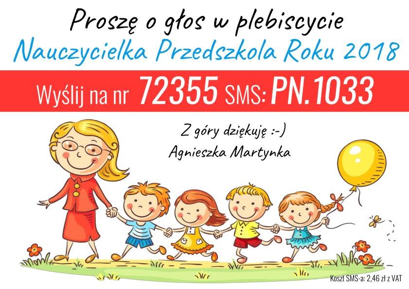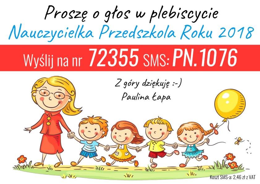 Kochani! Nasze Przedszkole zostało zgłoszone do plebiscytu "Przedszkole Roku"! Serdecznie dziękujemy za okazane zaufanie i prosimy o głosy. Wystarczy wysłać sms-a (koszt 2,46 zł z VAT) pod wskazany w grafice adres. Przy okazji zachęcamy także do głosowania na nasze wspaniałe nauczycielki panią Patrycję, panią Agnieszkę oraz panią Paulinę w plebiscycie "Nauczycielka Przedszkola roku 2018".