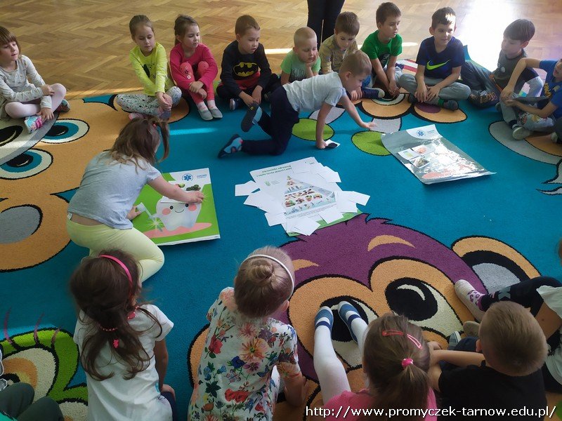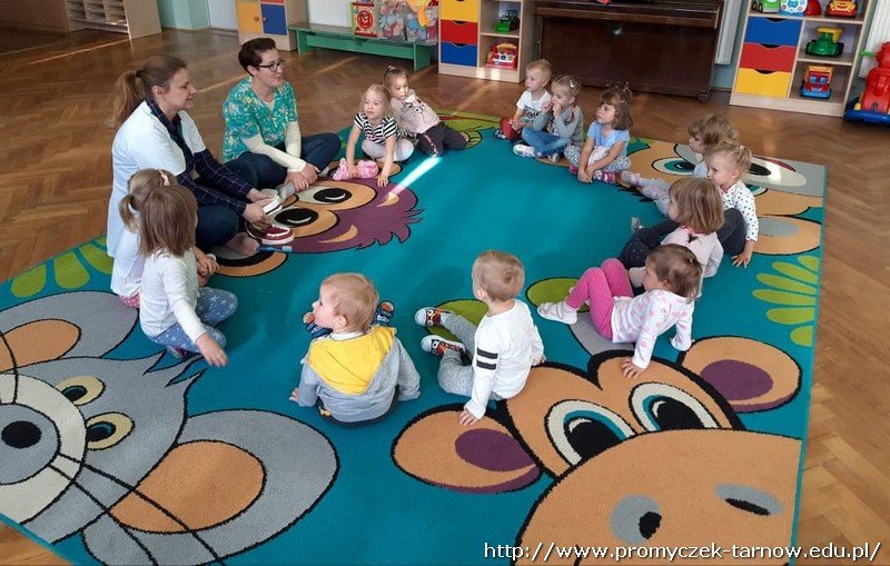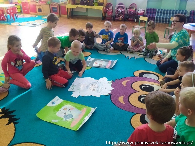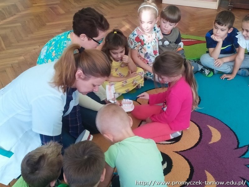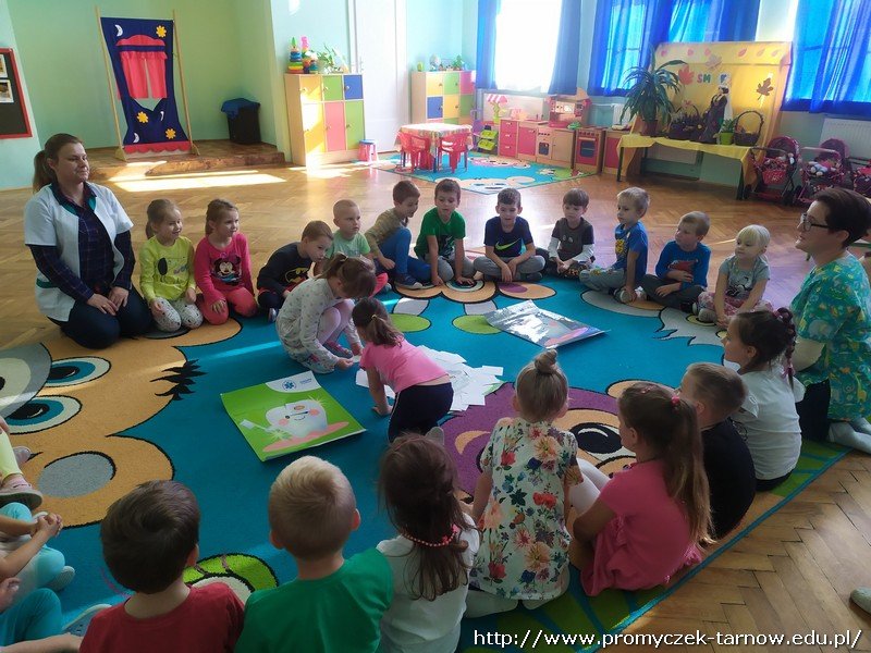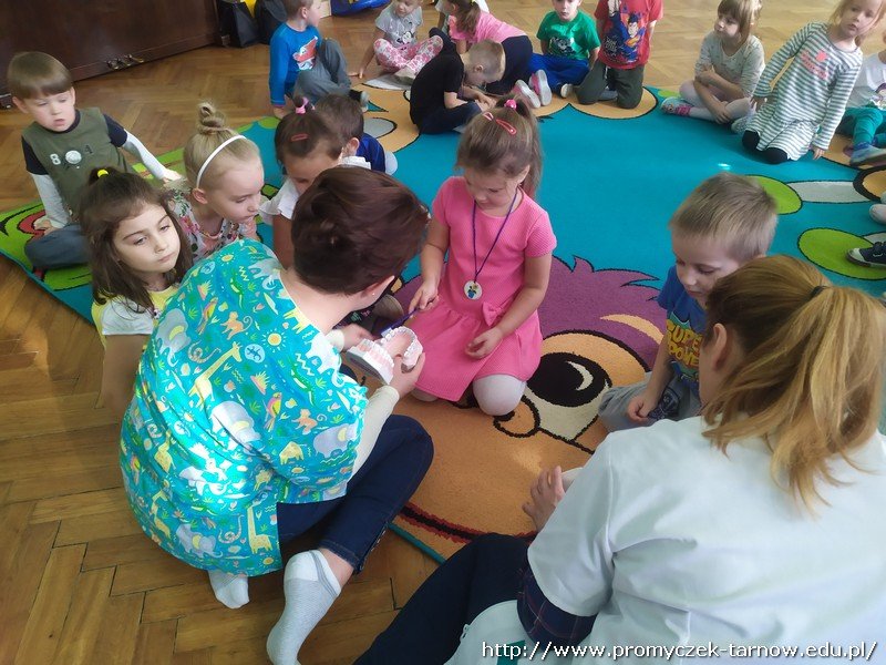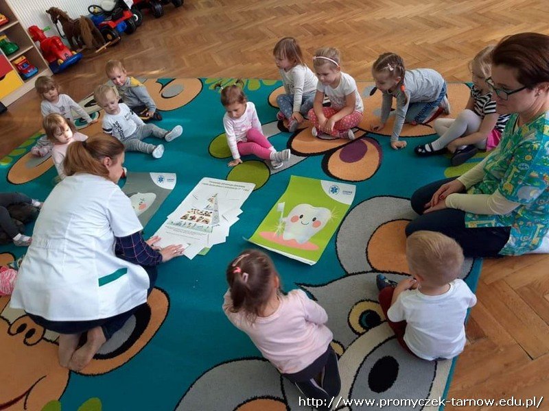 W dniu 16 października przedszkole odwiedziły dwie Panie Stomatolog z Mościckiego Centrum Medycznego. W tym dniu dzieci miały możliwość dowiedzenia się o zawodzie dentysty, czym się zajmuje i jak wygląda praca stomatologa. Pani dentystka zaprezentowała na manekinie w jaki sposób prawidłowo myć zęby. Dzieci chętnie naśladowały i uczyły się. Nie zabrakło tańców, śpiewów oraz pouczającej bajki o higienie jamy ustnej i o " Wróżce Zębuszce" Była to bardzo wartościowa lekcja. Na koniec Promyczki dostały upominki od pań. Serdecznie dziękujemy :)