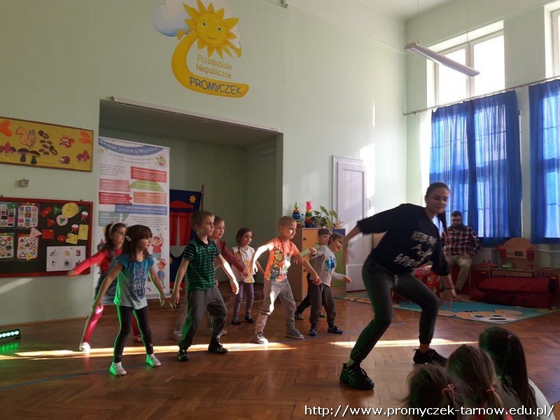 Pod koniec tygodnia 15 listopada nasze przedszkole po raz kolejny odwiedziła uwielbiana przez dzieci Pracownia Jaszczur&Przyjaciele. Tego dnia przedszkolaki poznały rożne style tanca m.in. latino, hip hop czy disco dance. To wszystko pokazała im Pani Konstancja, która na codzień zajmuje się tańcem. Dzieci miały okazje nauczyć się układu tanecznego hip hop pod okiem pani Konstancji. Był to cudowny czas " Promyczki" podczas pokazu siedziały na dywanie jak zaczarowane i z zachwytem podziwały występ.