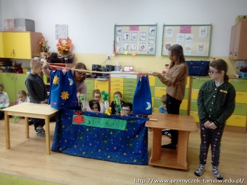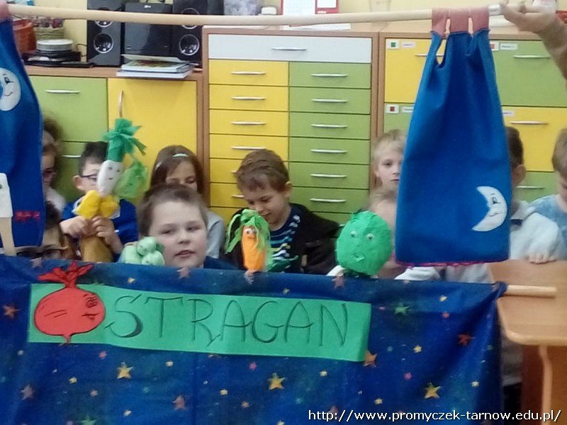 31 października odwiedzili nas koledzy ze szkoły podstawowej nr 25 w Tarnowie. Przedstawili nam teatrzyk kukiełkowy do wiersza Jana Brzechwy "Na straganie". Na koniec pani Emilia opowiedziała nam o szkole i zaprosiła do odwiedzania.