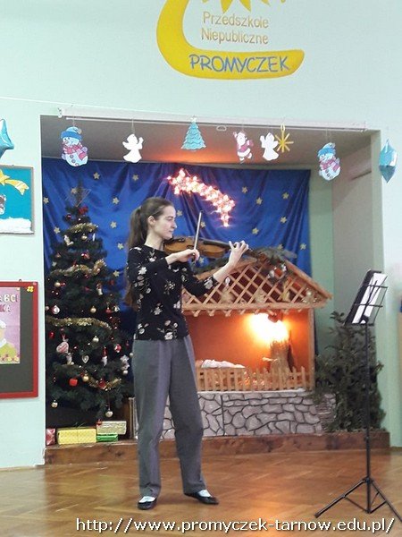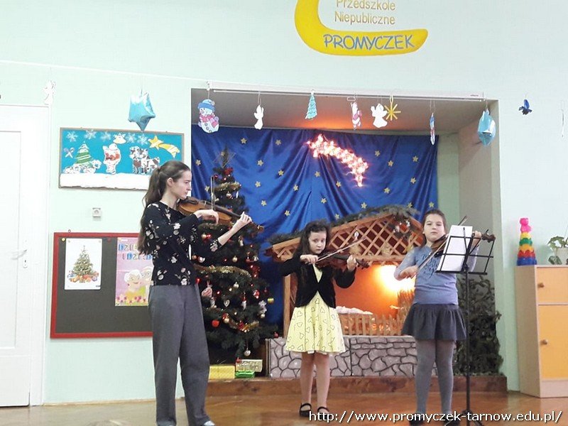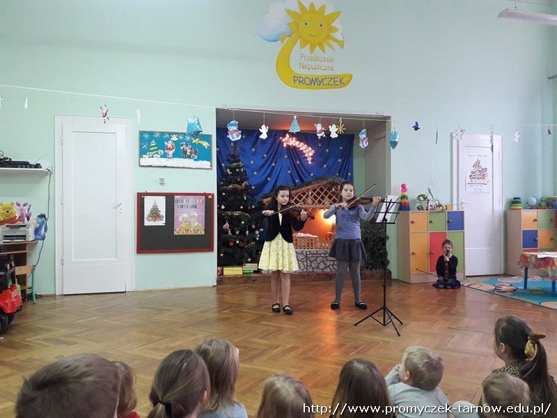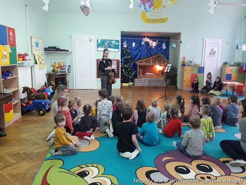 W dniu 23 stycznia nasze przedszkole odwiedzili specjalni goście ze Szkoły Muzycznej w Tarnowie a mianowicie uczennice wraz ze swoimi Paniami nauczycielkami z zespołu muzycznego "Grające groszki" prezentując grę na instrumentach smyczkowych.Mieliśmy przyjemność wysłuchać cudownego koncertu kolędowego. Pani opowiedziała w jaki sposób uczniowie uczą się grać na instrumentach i zachęcała dzieci do korzystania z instrumentów jak najczęsciej. Serdecznie dziękujemy i zapraszamy ponownie.