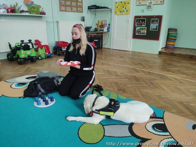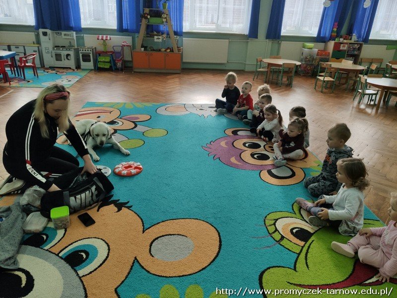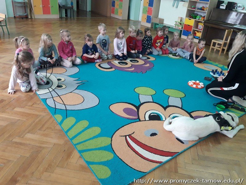 24 listopada nasze przedszkole odwiedził specjalny gość - pies o imieniu "Łobuz" wraz ze swoim opiekunem. W tym niezwykłym spotkaniu miały okazję uczestniczyć nasze przedszkolaki, które poznały specyfikę pracy psa terapeuty. Dowiedziały się jak należy zachowywać się w obecności psa, jak prawidłowo go karmić oraz w jakich sytuacjach nie należy do niego podchodzić. Wizyta psa terapeuty była niezwykłym doświadczeniem, a wspólne zabawy oraz sztuczki wykonywane przez Łobuza zrobiły na naszych przedszkolakach ogromne wrażenie.
