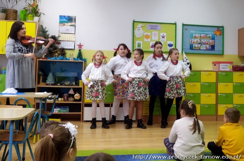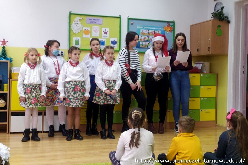 Dzień przed przedszkolną Wigilią, 17 stycznia, najstarszą grupę Zuchów odwiedzili goście - starsze koleżanki ze Szkoły Podstawowej nr 2 w Tarnowie. Zaśpiewały Zuchom piękne kolędy i pastorałki, a gromkie brawa mogły oznaczać tylko jedno - występy bardzo się podobały. Każdy Zuch otrzymał także wyjątkowy upominek - niepowtarzalną ozdobę świąteczną w postaci własnoręcznie wykonanego skrzata. Jeszcze raz dziękujemy i życzymy Wesołych Świąt!