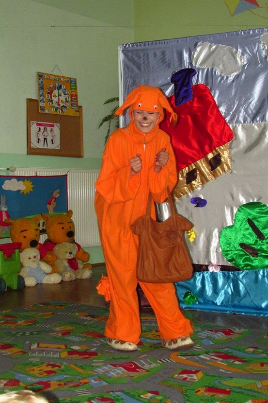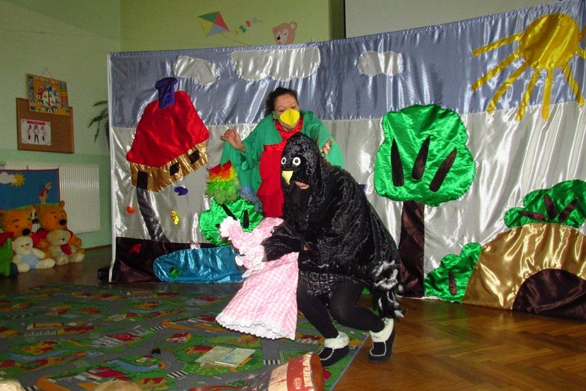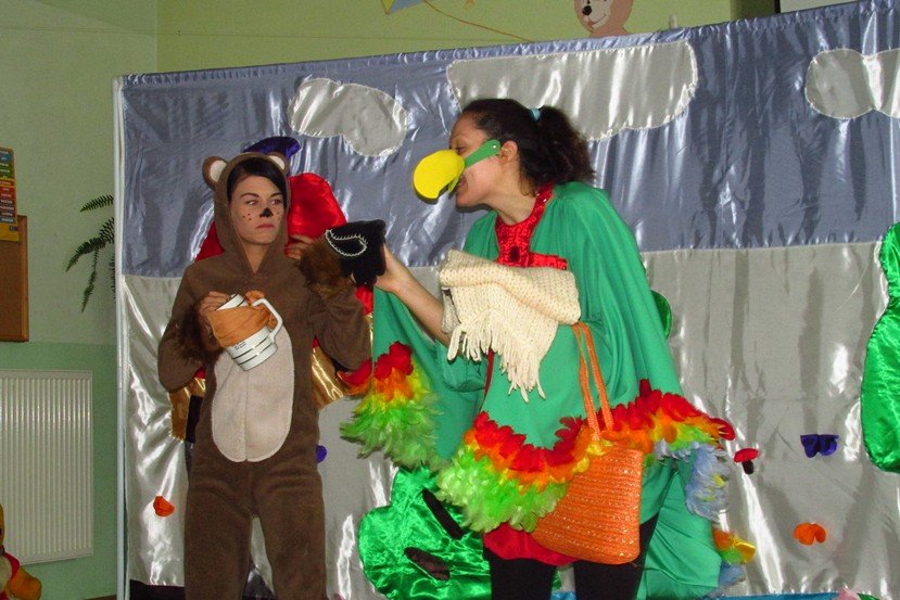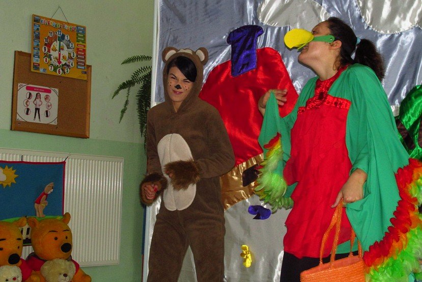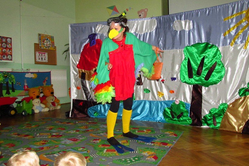 Dzieci miały okazję poznać Papużkę Okruszkę, Misia Zdzisia i Wiewiórkę Zosię. Mili goście opowiedzieli o zmianach, jakie niesie ze sobą aktualna pora roku, zadawali naszym Promyczkom zagadki, śpiewali piosenki.