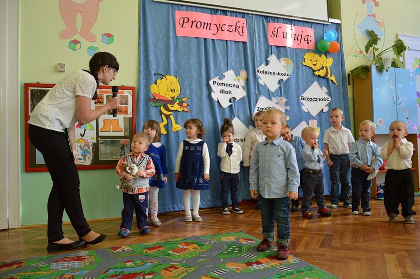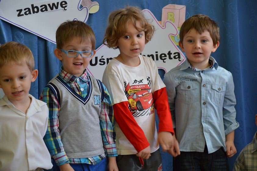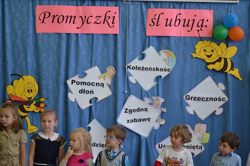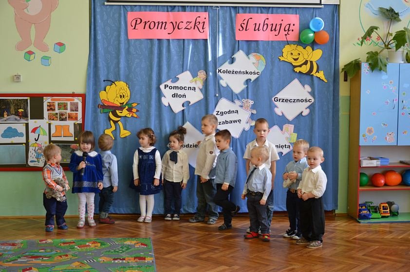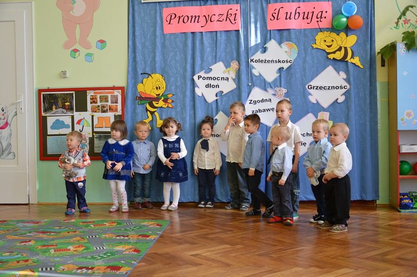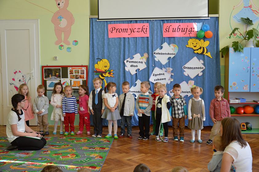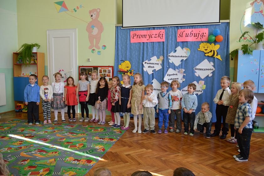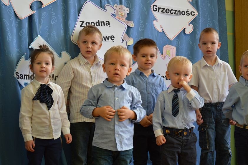 Uroczystość miała miejsce 5 listopada 2014 roku. Dzieci w odświętnych strojach zebrały się w sali Smyków. Po krótkim powitaniu przez panią dyrektor nadszedł czas na część artystyczną. Jako pierwsze na scenie pojawiły się najmłodsze dzieci. Brawurowo wykonały piosenkę połączoną z ilustracją ruchową. Jako drugie występowały nasze średniaki, które popisały się pięknym śpiewem i recytacją. Starszaki, chociaż ich występ był ostatni – zaprezentowały się pierwszorzędnie.