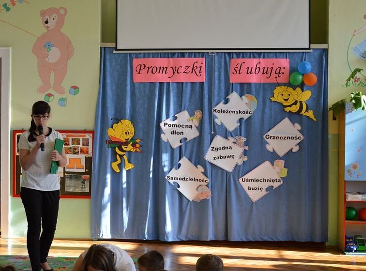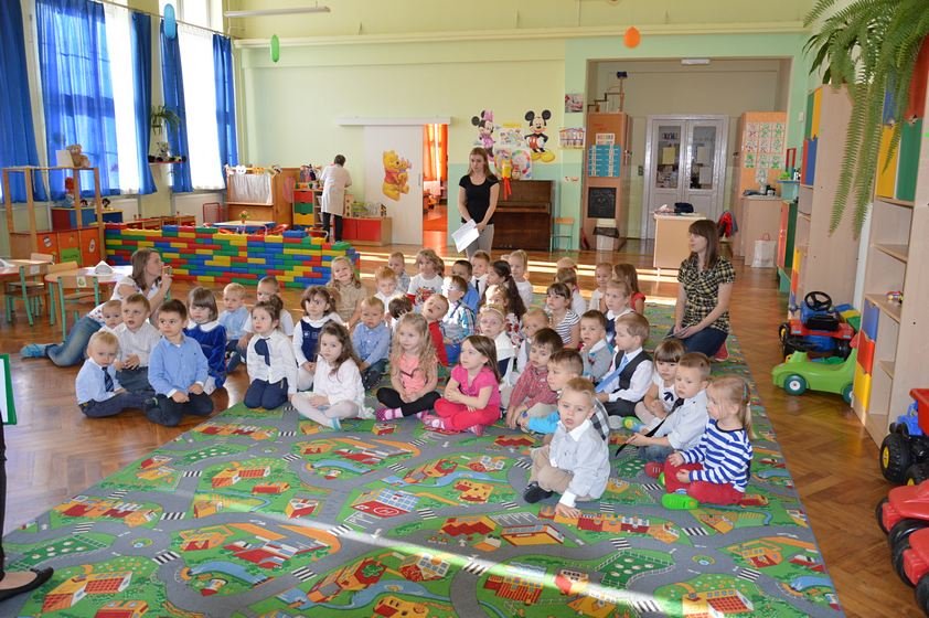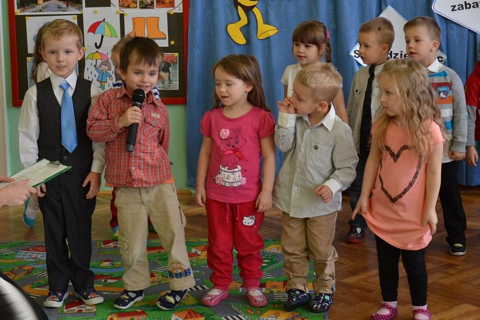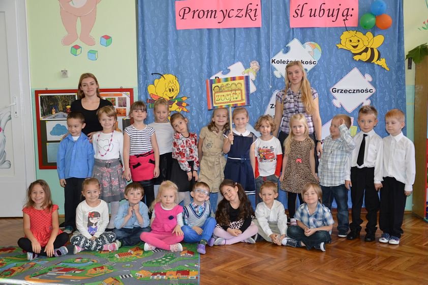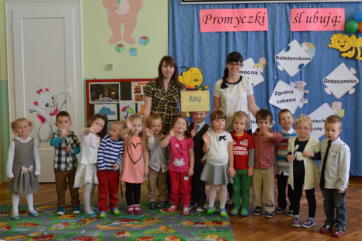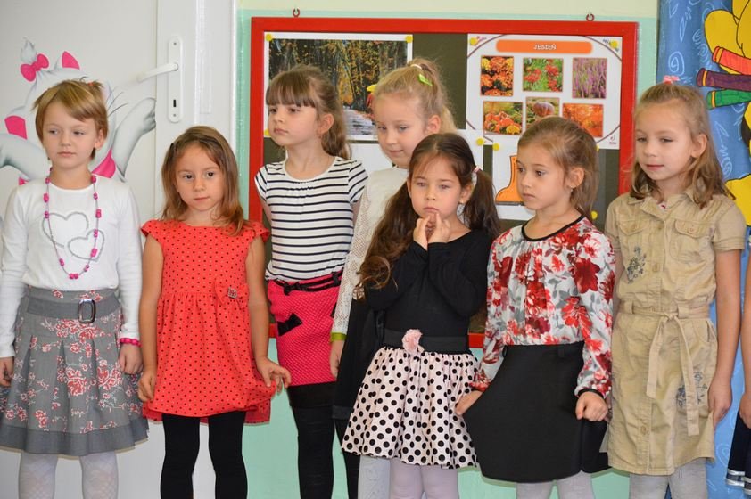 Uroczystość miała miejsce 5 listopada 2014 roku. Dzieci w odświętnych strojach zebrały się w sali Smyków. Po krótkim powitaniu przez panią dyrektor nadszedł czas na część artystyczną. Jako pierwsze na scenie pojawiły się najmłodsze dzieci. Brawurowo wykonały piosenkę połączoną z ilustracją ruchową. Jako drugie występowały nasze średniaki, które popisały się pięknym śpiewem i recytacją. Starszaki, chociaż ich występ był ostatni – zaprezentowały się pierwszorzędnie.