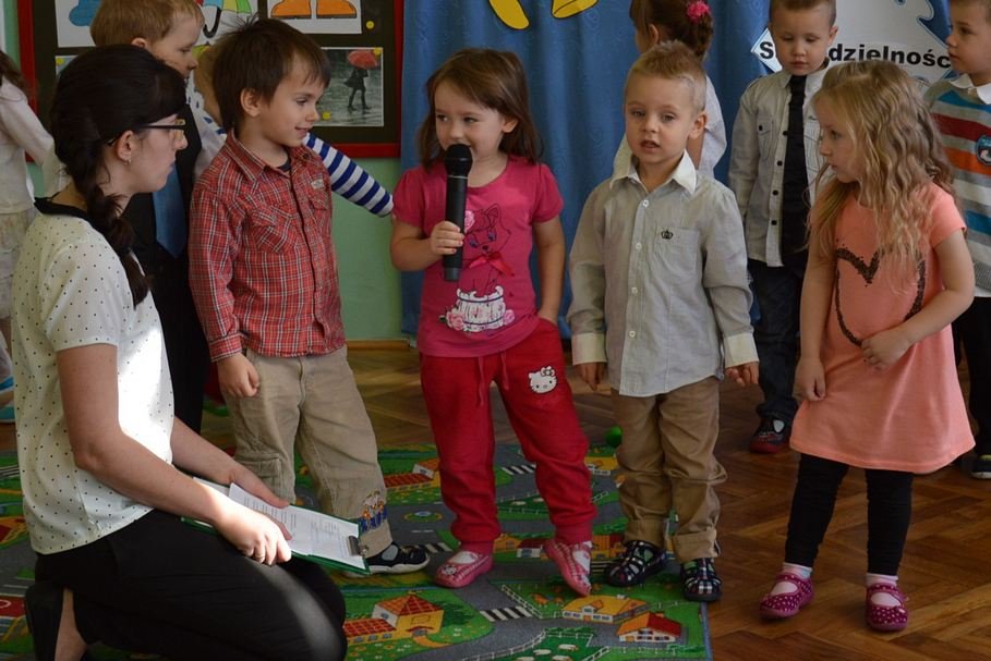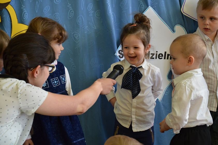 Gdy część artystyczna dobiegła końca dzieci zostały jeszcze delikatnie „przetestowane’ przez prowadzącą – panią Ulę. Każda grupa musiała rozpoznać zagadkowe dźwięki, wykonać proste zadanie, a także odpowiedzieć na kilka pytań. Dzieci świetnie poradziły sobie z przygotowanymi konkurencjami, dlatego w nagrodę zostały im nadane nazwy grup – Smyki, Asy i Zuchy.