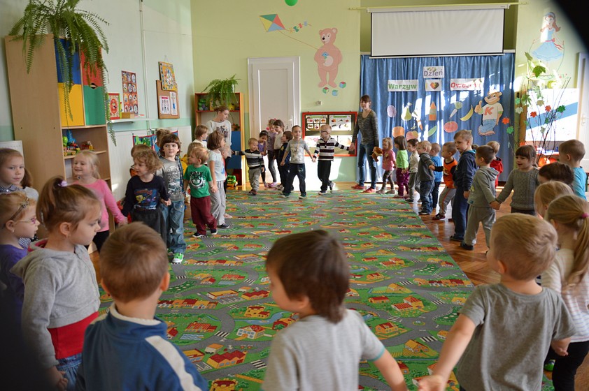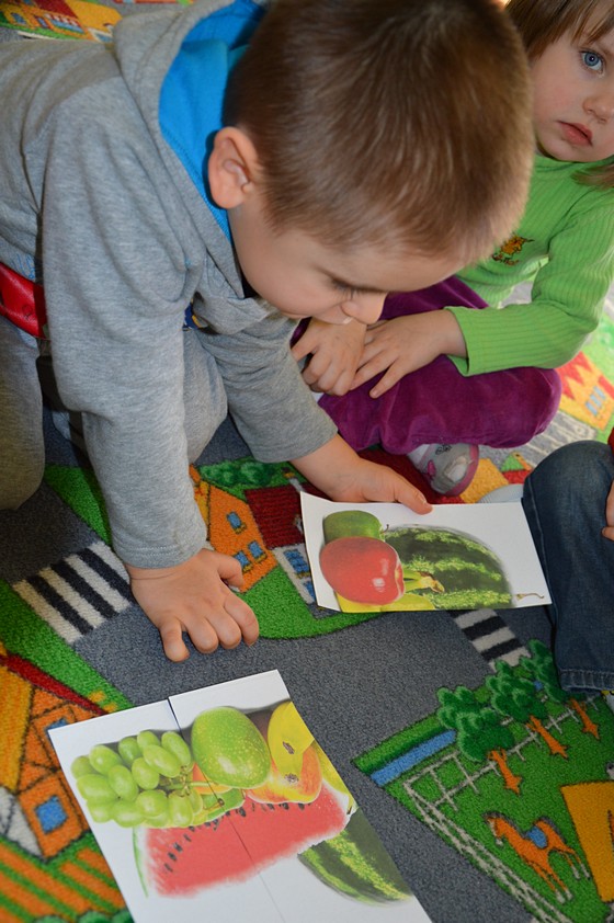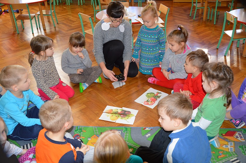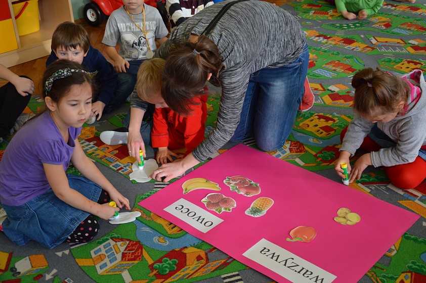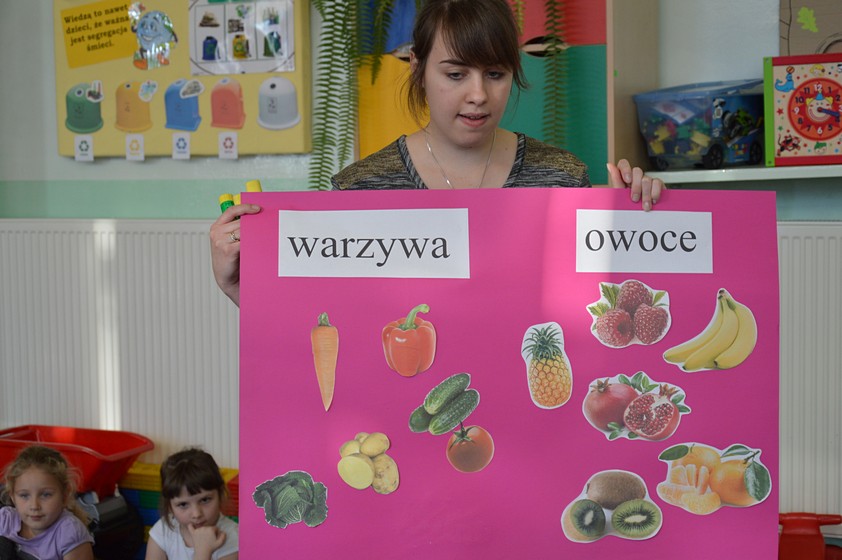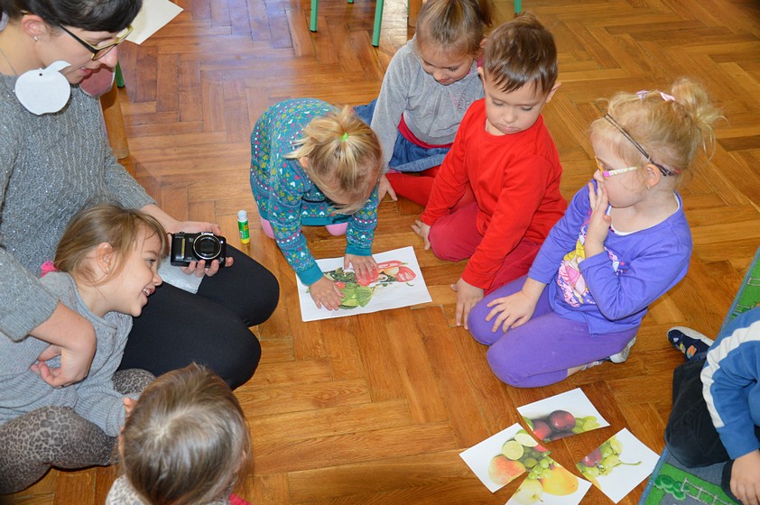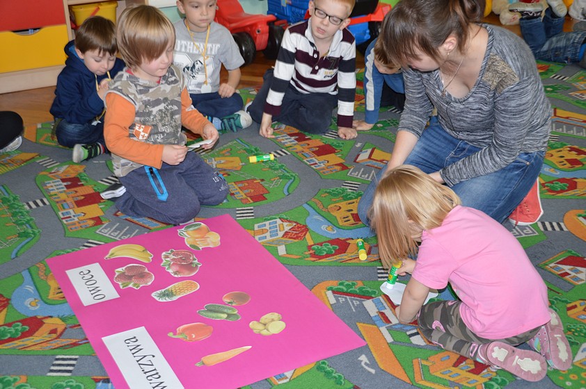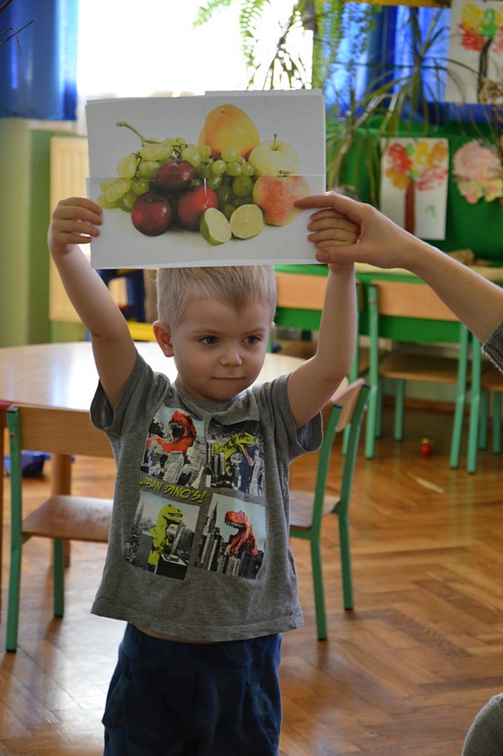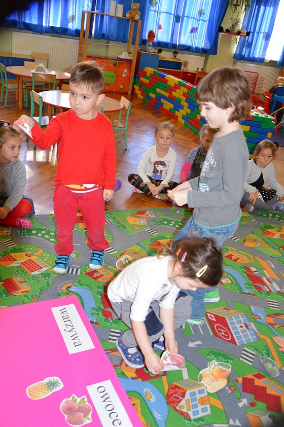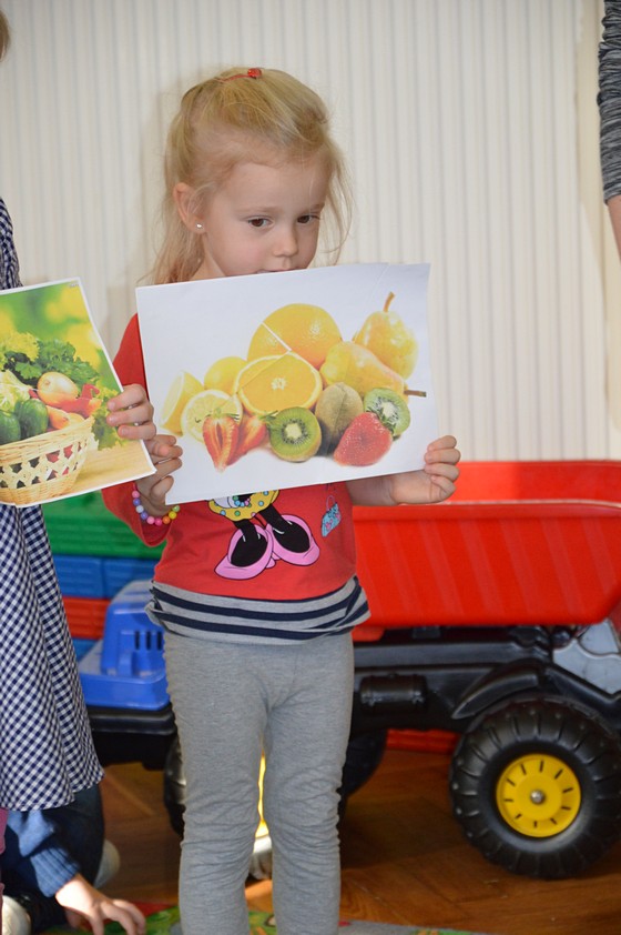 Owocowo – warzywne zabawy w sali Smyków przygotowała dla nas pani Paulinka. Były wspólne tańce, rozpoznawanie warzyw i owoców, pogadanka na temat witaminowego ABC. Dzieci dowiedziały się, że w truskawkach i marchewce jest witamina A, która działa dobrze na wzrok, banany zawierają witaminę B lubianą przez nasze brzuchy, a kiwi - witaminę C, która wspomaga odporność.