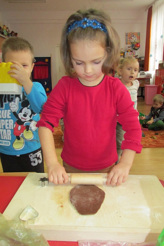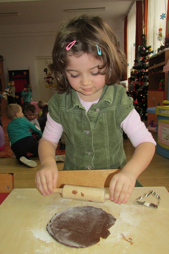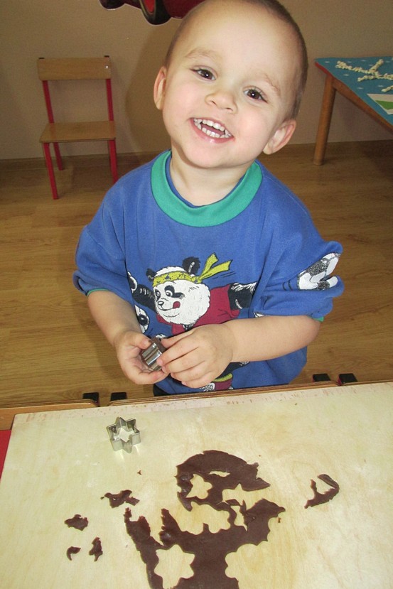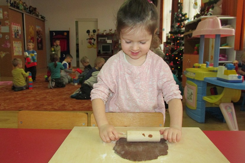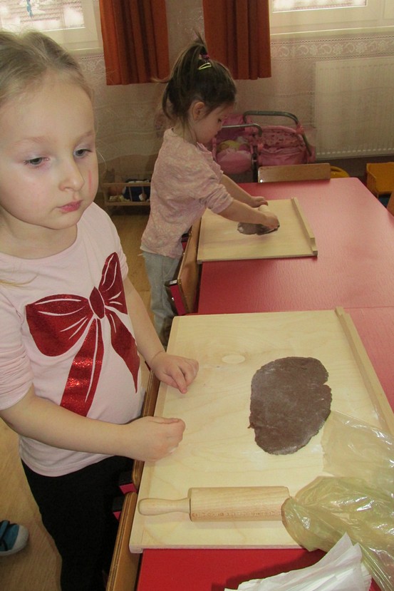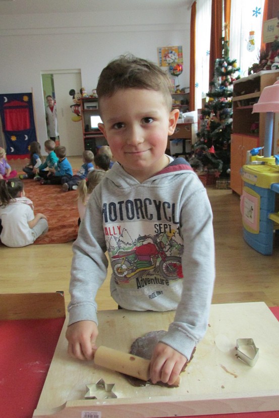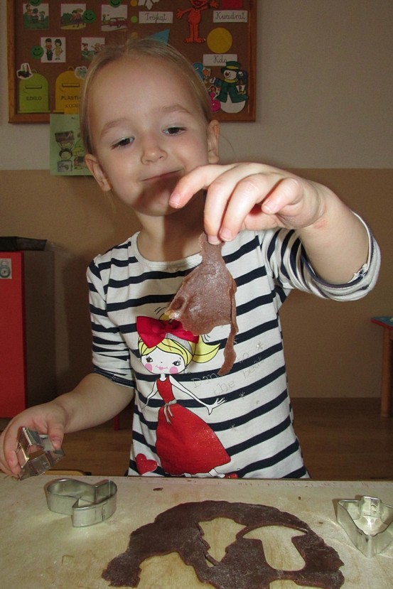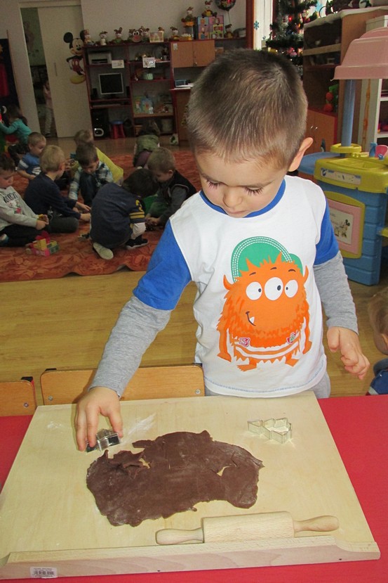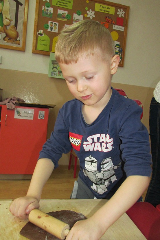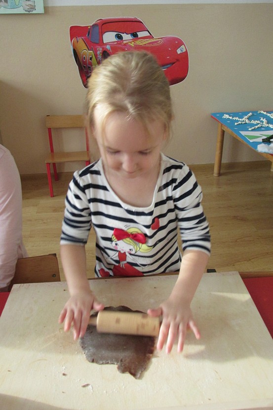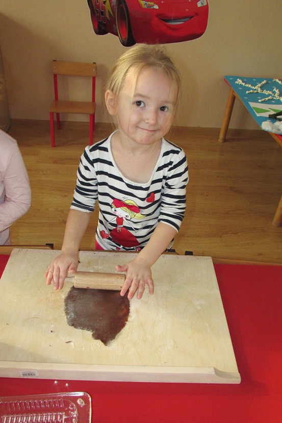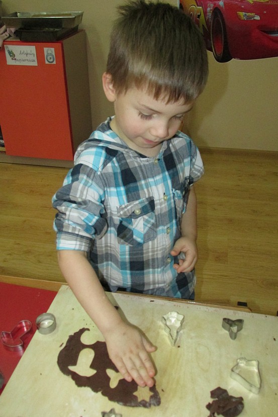 Każde dziecko otrzymało kawałek ciasta, które musiało na początku rozwałkować , a następnie wykrawać z niego świąteczne kształty. Pani Ania i pani Ula służyły swoją pomocą przy tych działaniach, jednak okazało się, że wszyscy poradzili sobie doskonale!